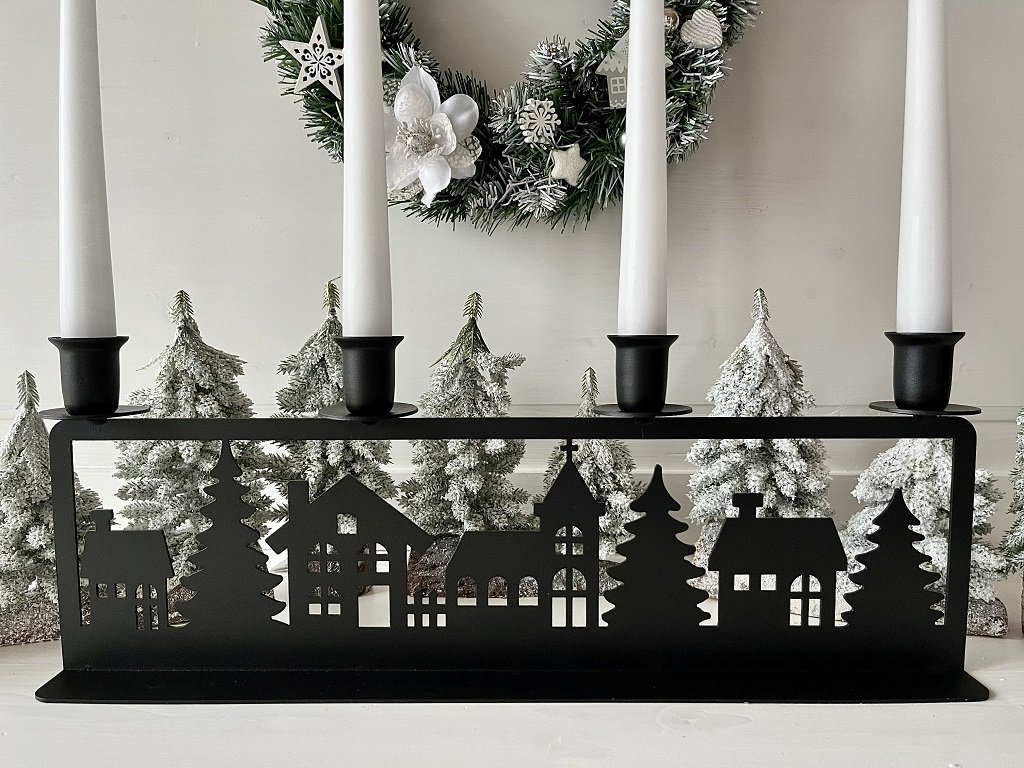 Ozdobte si Vánoce. Černý bytelný adventní kovový svícen s domky, kostelem a stromečky jen tak nepřehlédnete. Vytvořte si slavnostní aranžmá, které podtrhne kouzelnou atmosféru vánočních svátků u Vás doma.