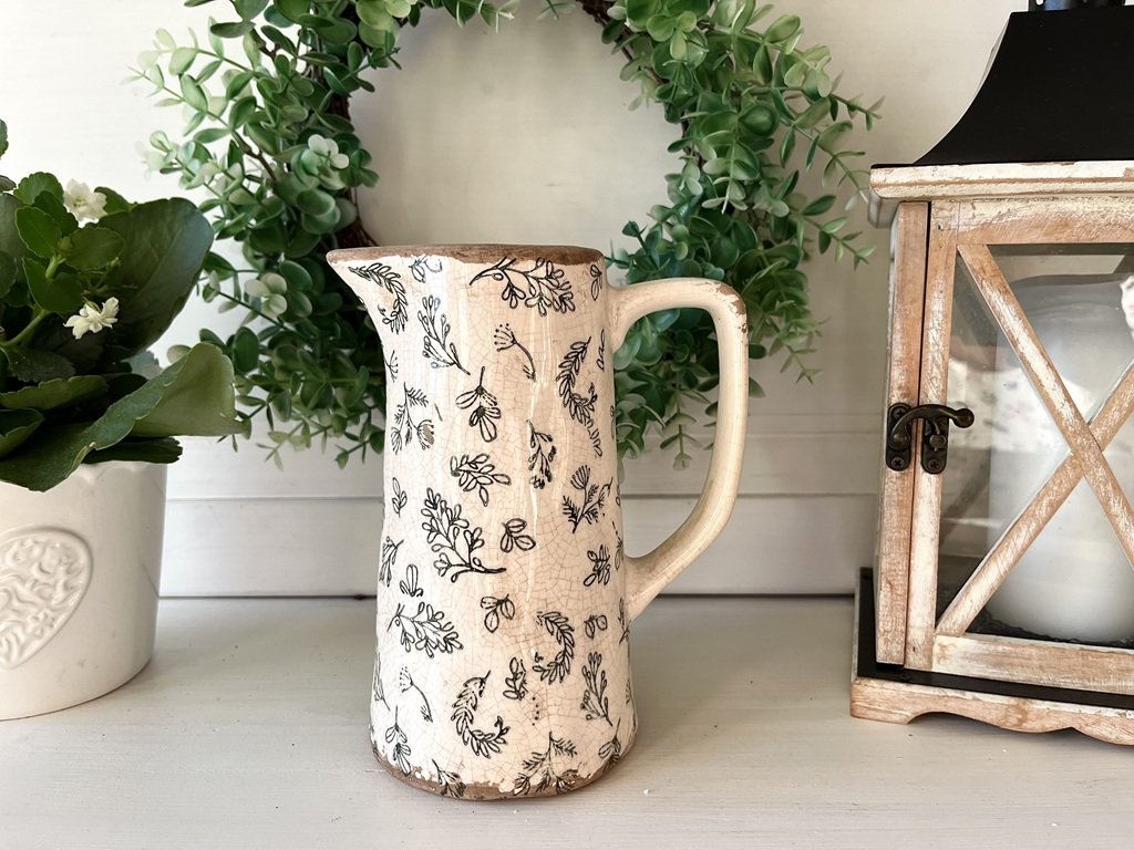 Krásný keramický džbán s drobnými kvítky v tmavě zelené barvě a úmyslně popraskaným glazovaným povrchem ve venkovském stylu se hodí pro všechny druhy květin.
