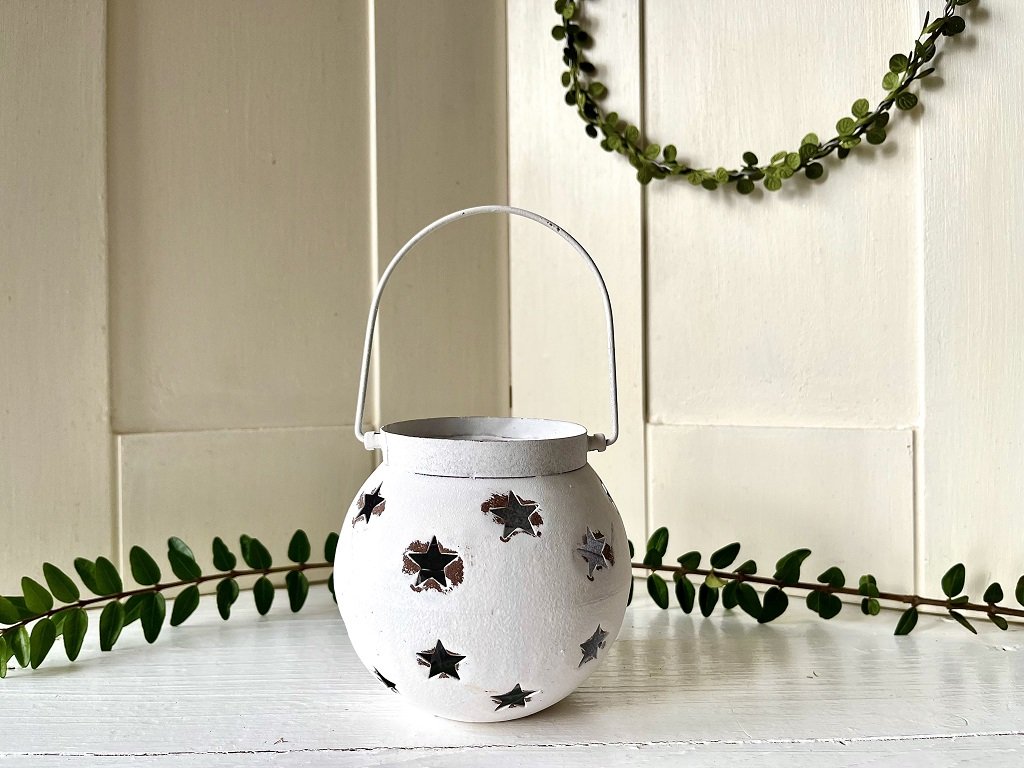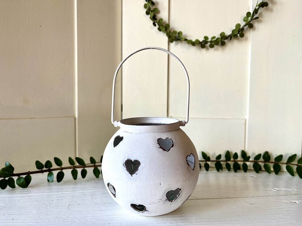 Ozdobte si Vánoce. Bílá kovová lucerna s motivem srdíček nebo hvězdiček dotvoří atmosféru Vašich slavnostních aranžmá.