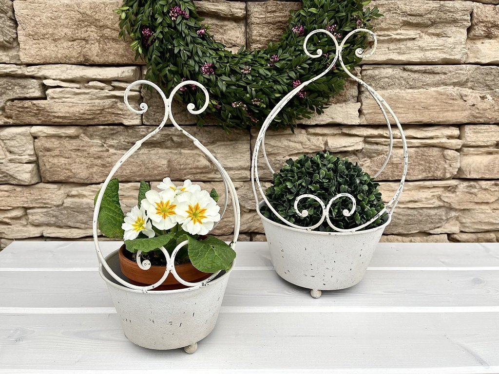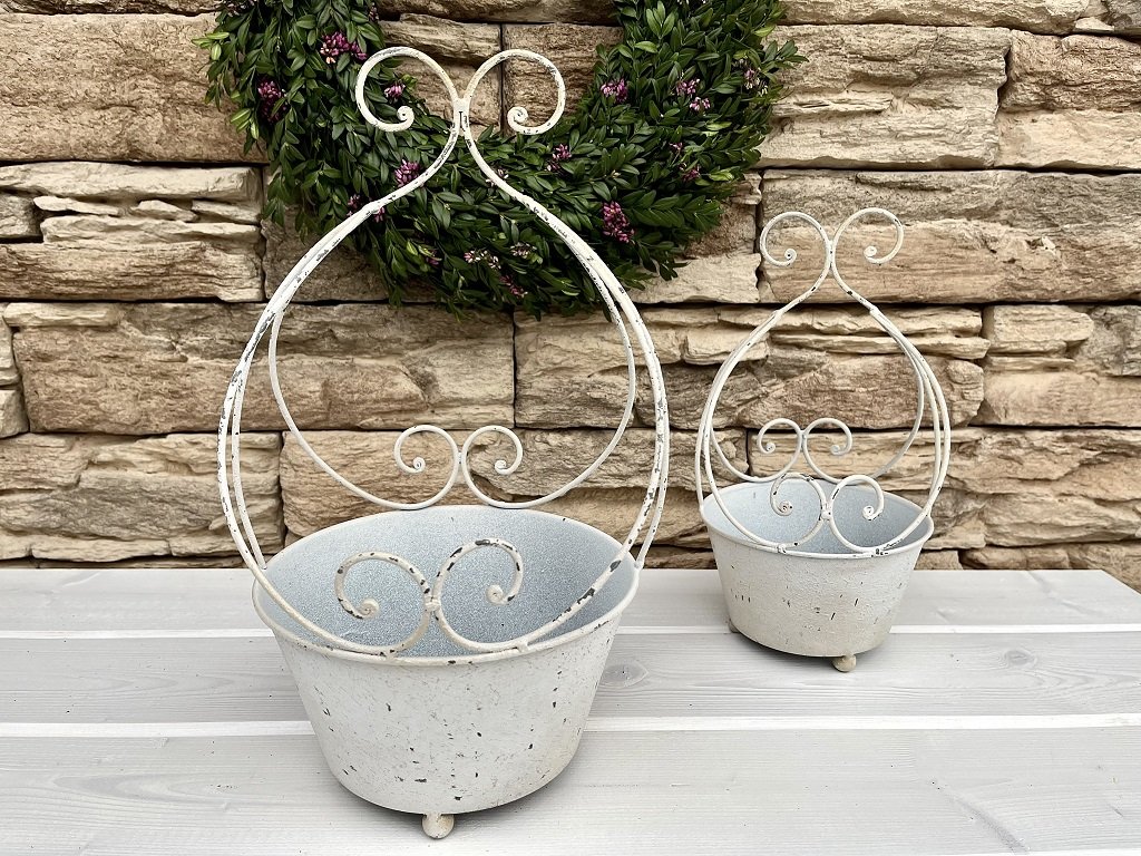 Bílá kovová ozdobná nádoba na květináč nebo k přímému osazení podtrhne krásu květin a zaujme svou nevšedností. Stvořeno pro milovnice vintage stylu.