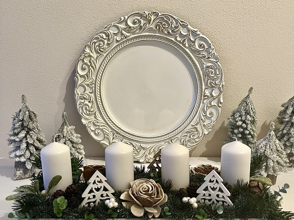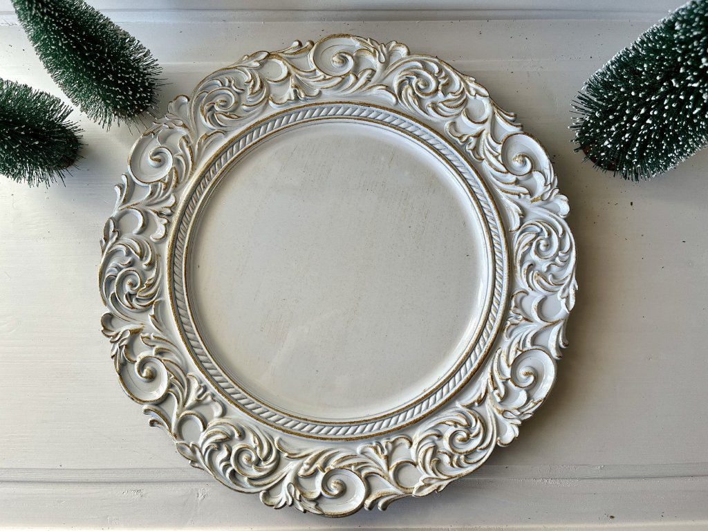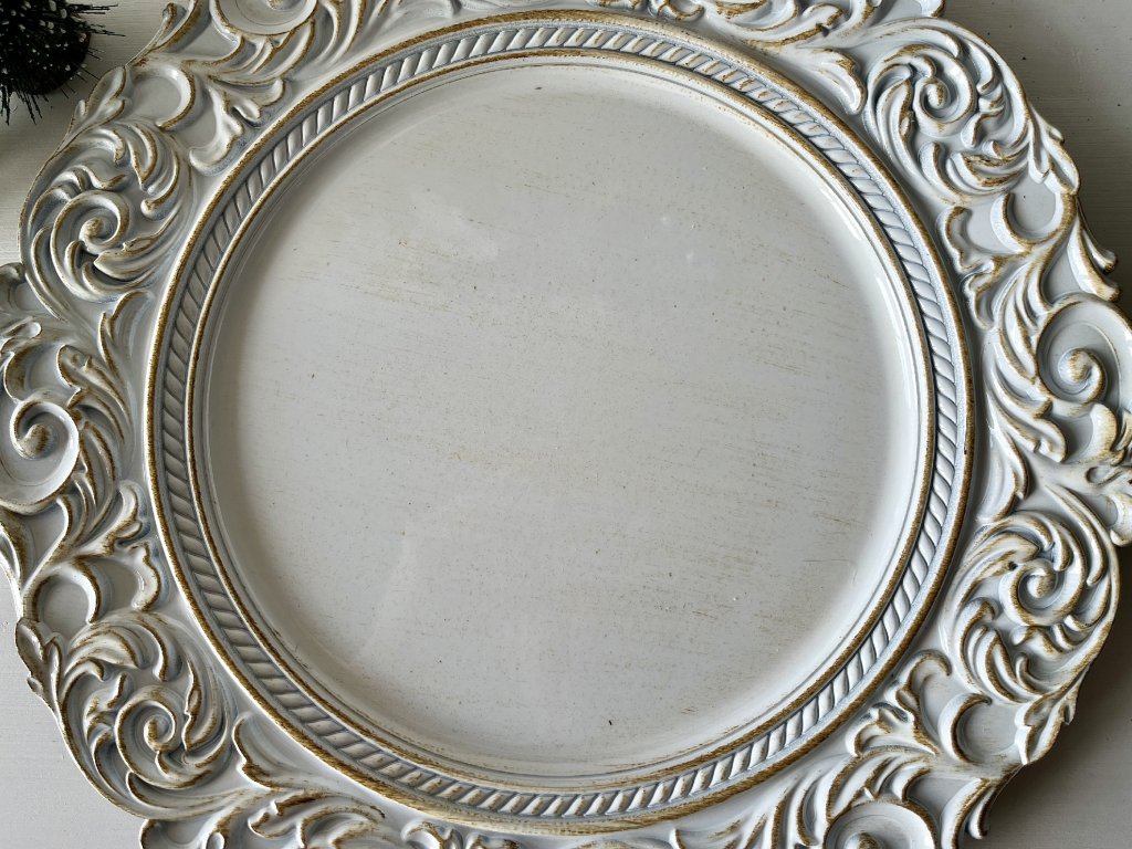 Krásný dekorativní bílo-zlatý talíř působí jemně díky svému krajkovému lemu. Naaranžujte si na něj květiny ve džbánu nebo v květináči, svíčky, lucernu nebo jiné drobné dekorace.