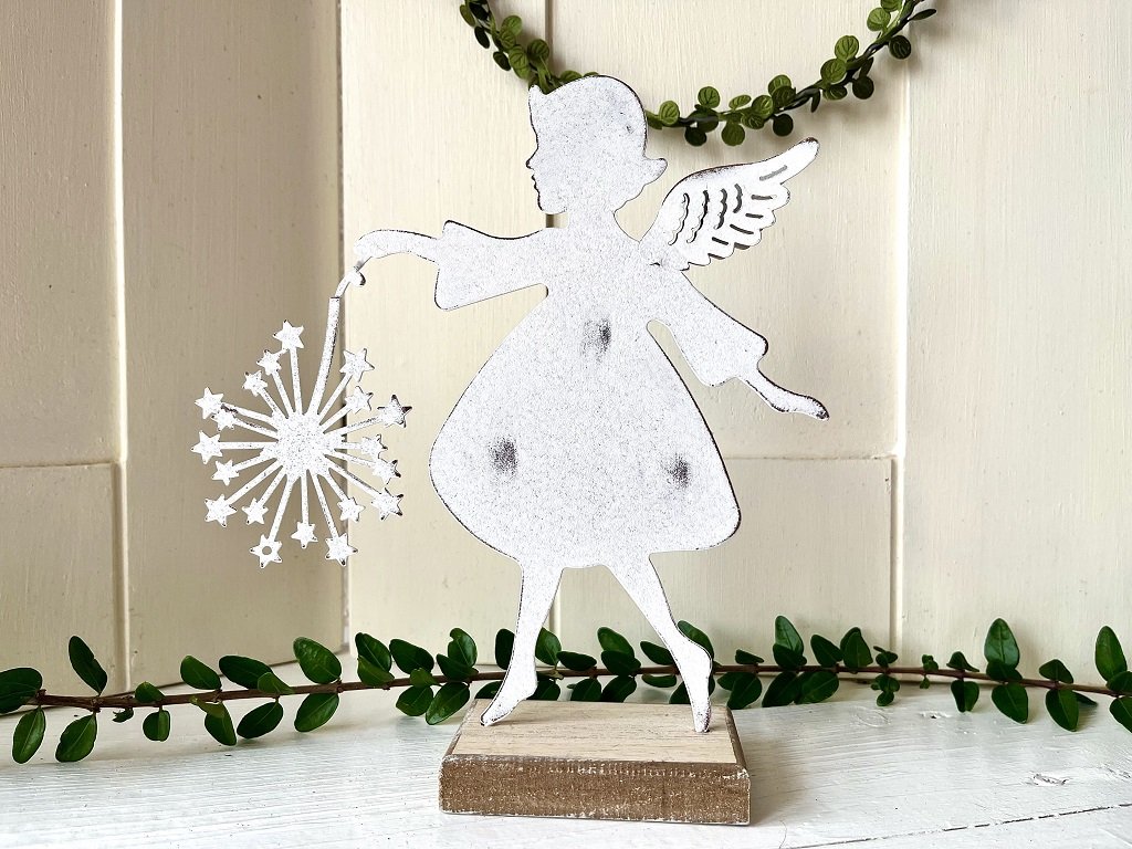 Ozdobte si Vánoce. Kovový anděl v bílé barvě na dřevěném podstavci dotvoří atmosféru Vašich slavnostních aranžmá.
