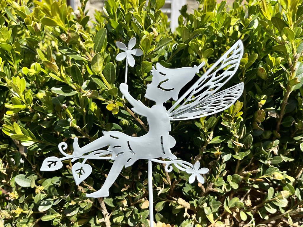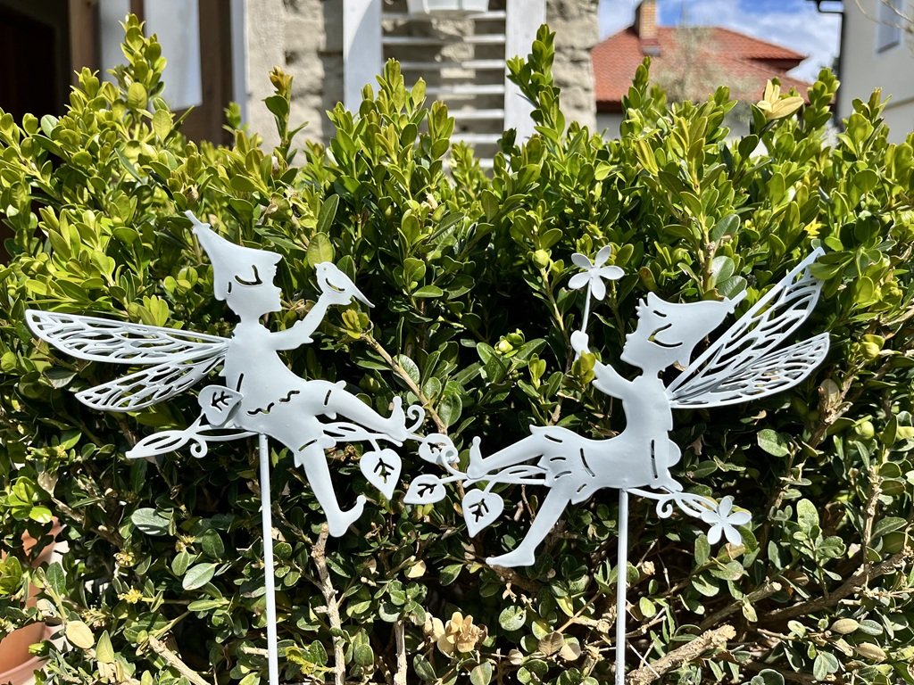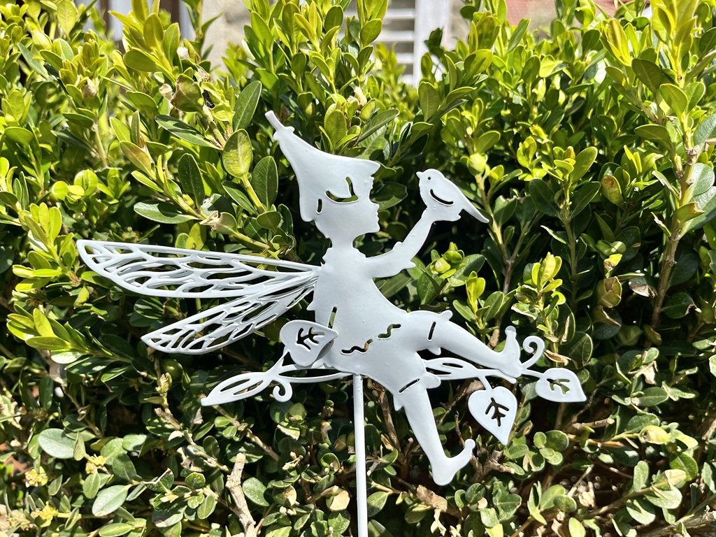 Bílý kovový zápich elfa sedícího na větvičce dodá květníkům nebo květinám v záhoně něžný nádech.