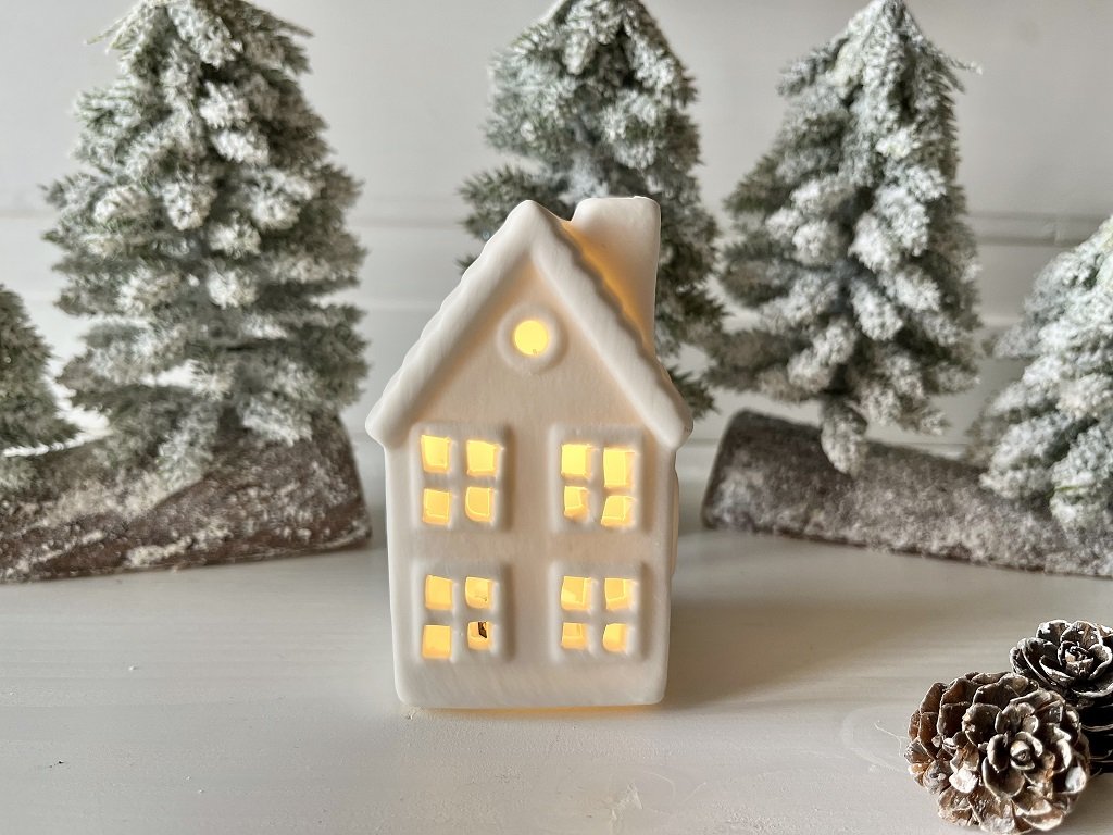 Malý keramický domeček s LED osvětlením v bílé barvě zútulní Váš domov za chladných podzimních a zimních večerů. Můžete ho využít při přípravě Vašich slavnostních aranžmá v kombinaci s jinými dekoracemi.