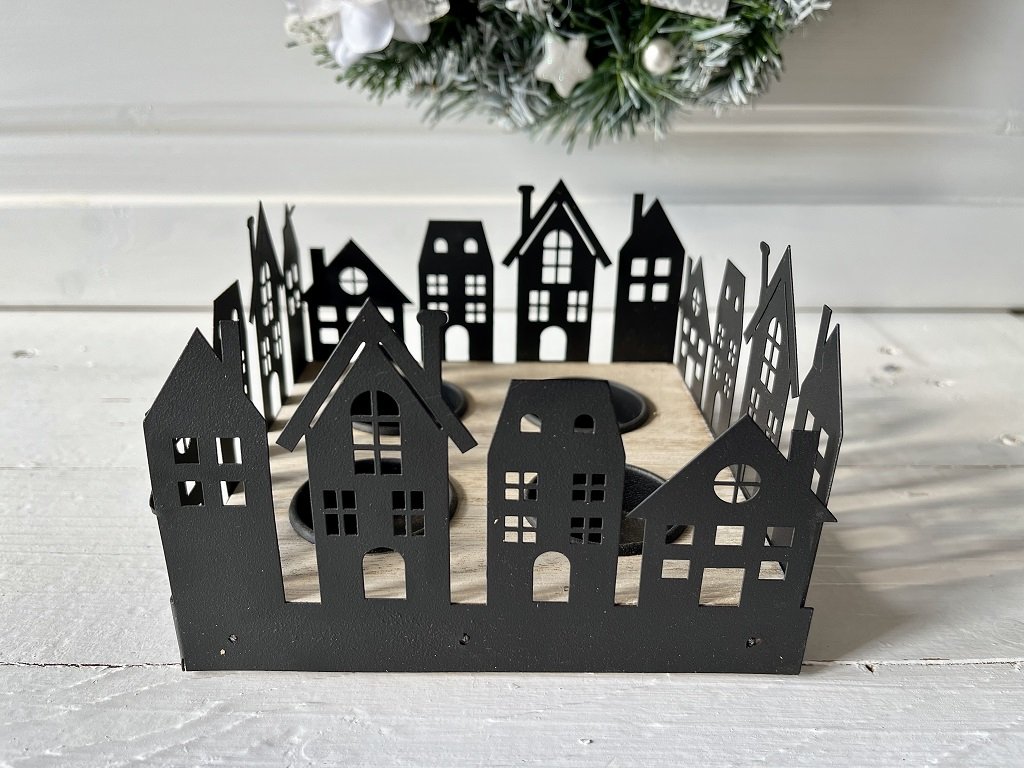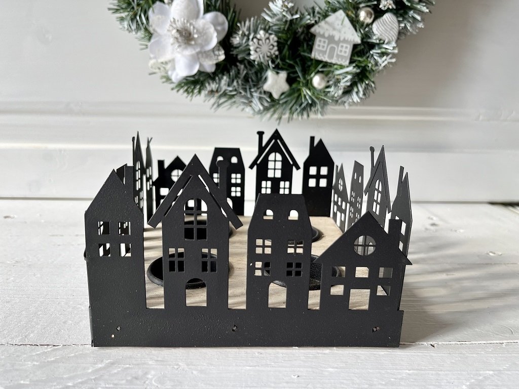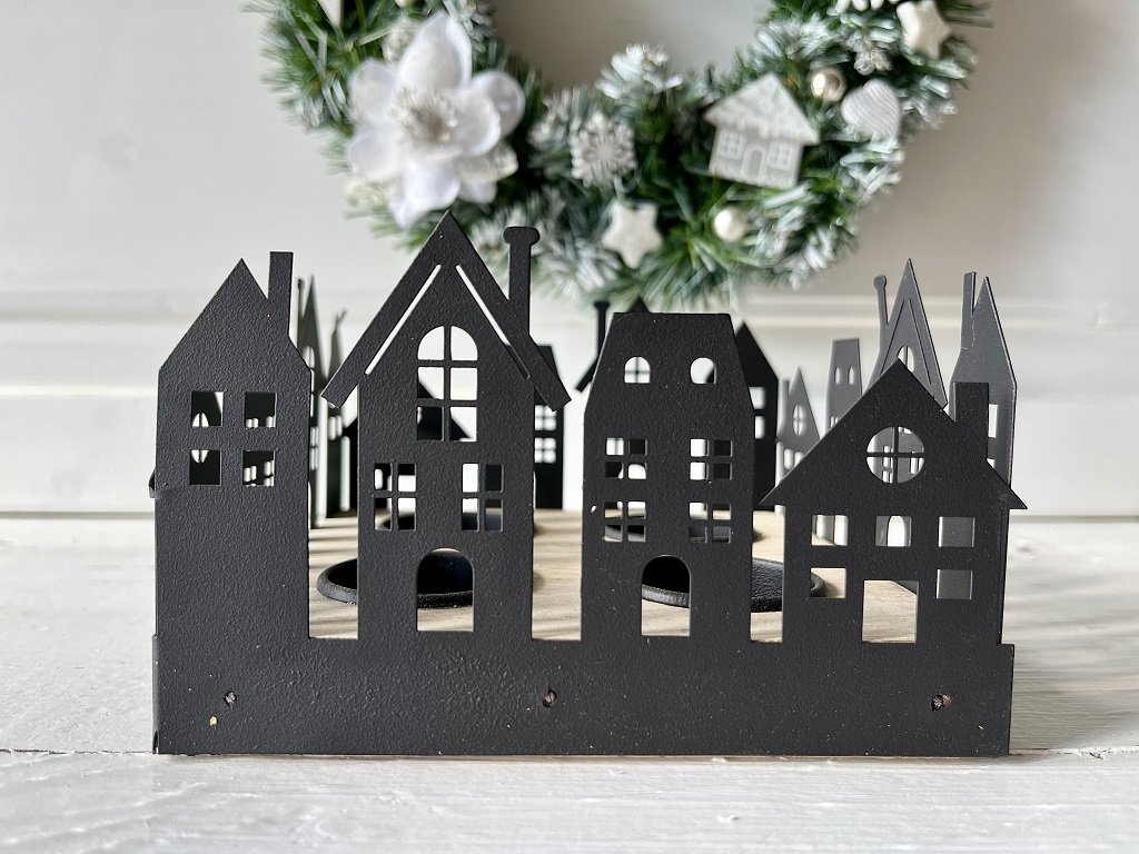 Ozdobte si Vánoce. Černý adventní kovový svícen s domečky, co tvoří náměstíčko, dotvoří atmosféru Vašich slavnostních aranžmá.