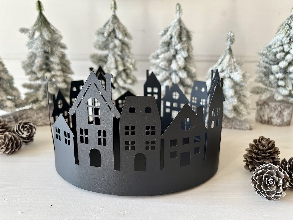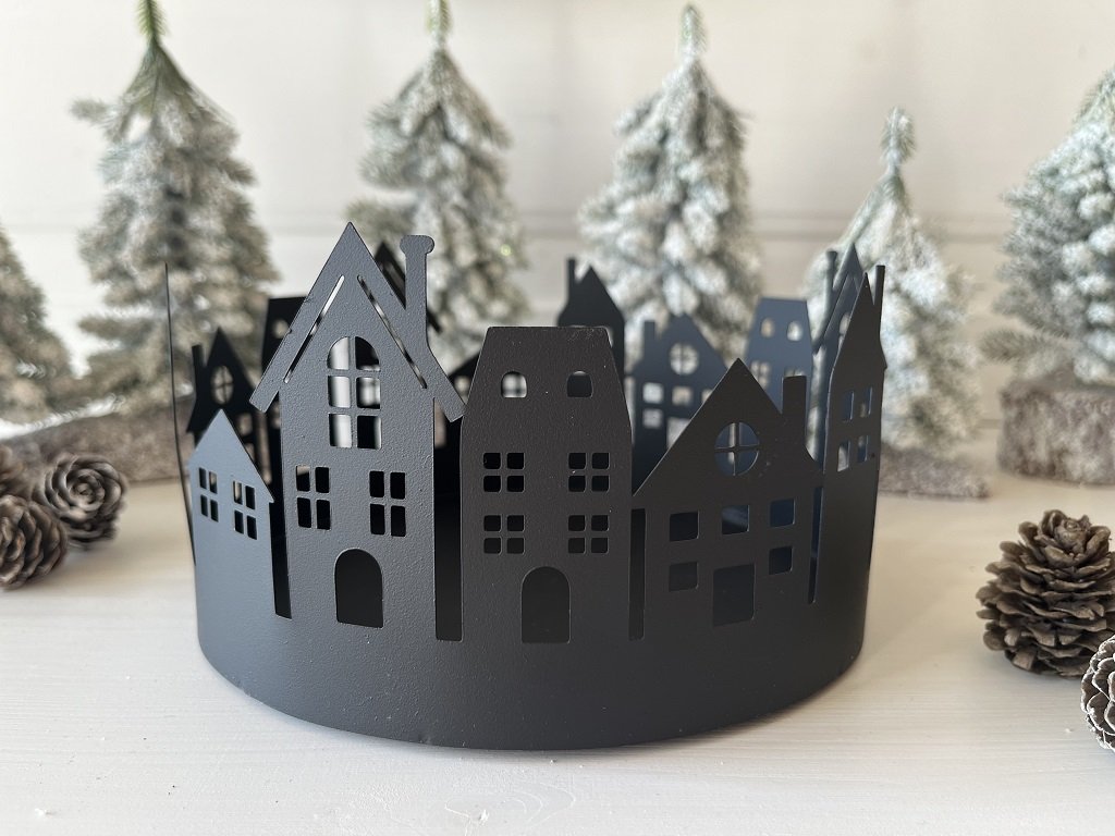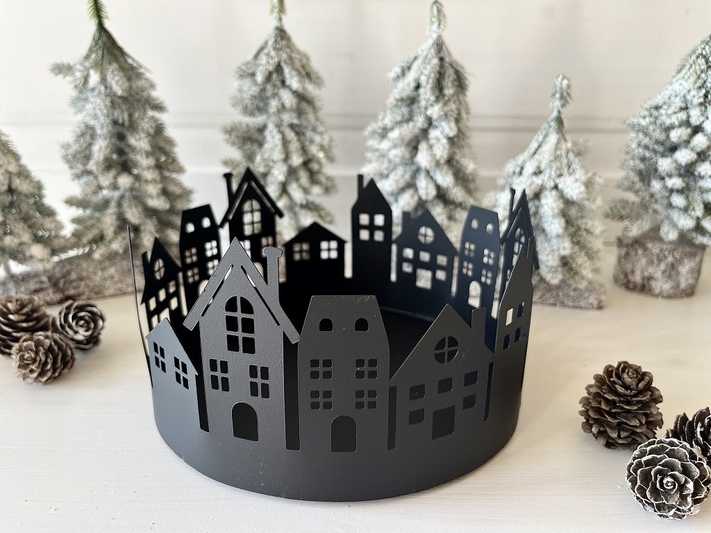 Ozdobte si Vánoce. Na černý kovový podnos, co tvoří náměstíčko, si můžete dát ozdoby, svíčky, zasněžené stromečky a vytvořit si tak slavnostní aranžmá.
