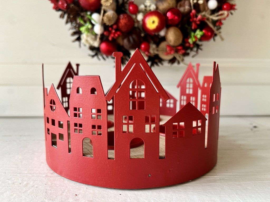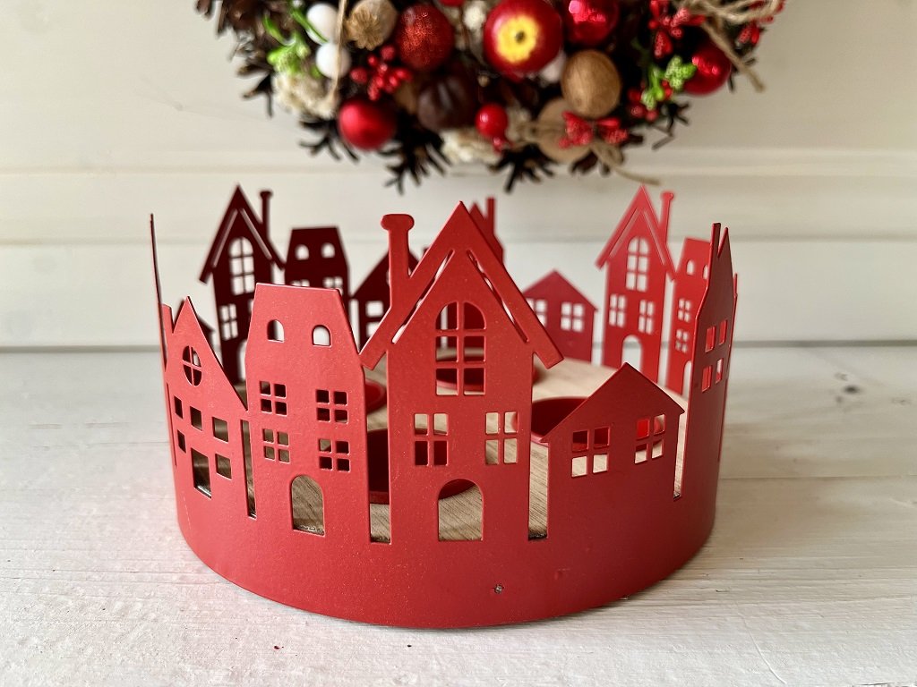 Ozdobte si Vánoce. Červený kovový adventní svícen s domečky, co tvoří náměstíčko, dotvoří atmosféru Vašich slavnostních aranžmá.