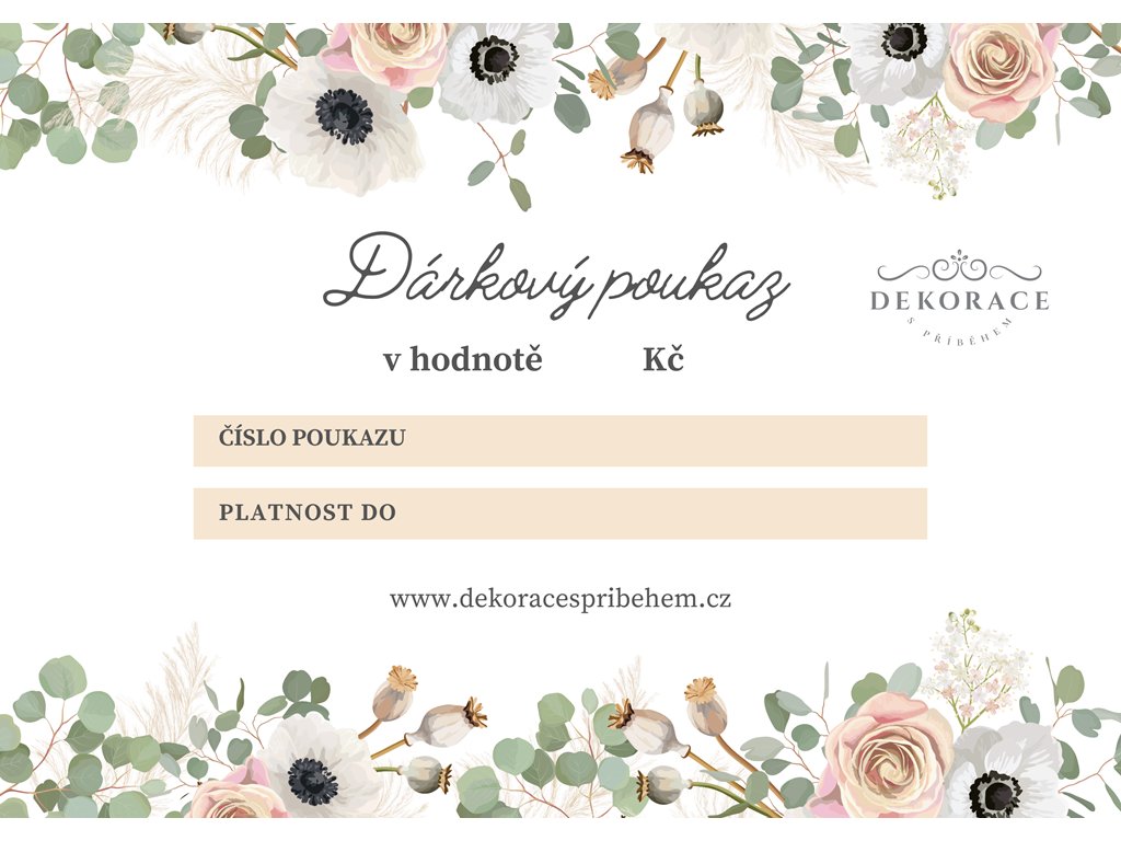 * Dárkový poukaz lze uplatnit pouze na zboží nabízené na stránkách obchůdku Dekorace s příběhem (www.dekoracespribehem.cz).