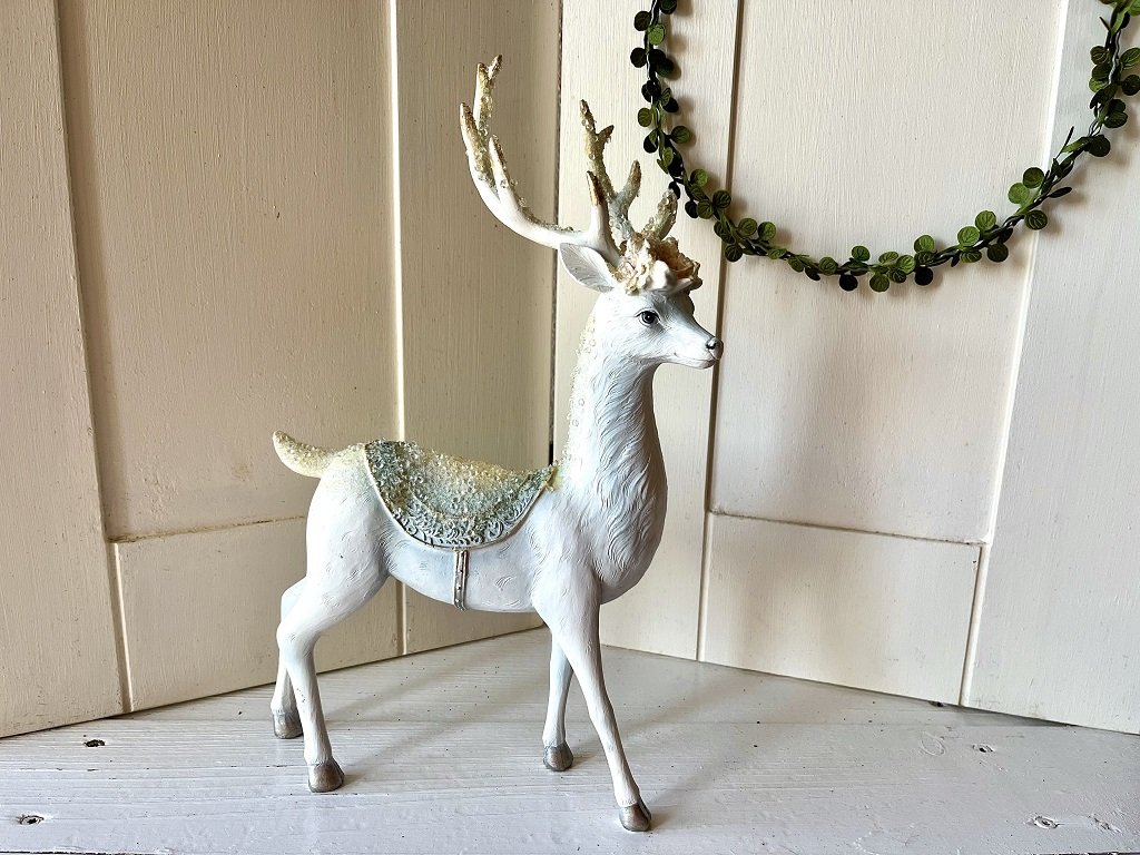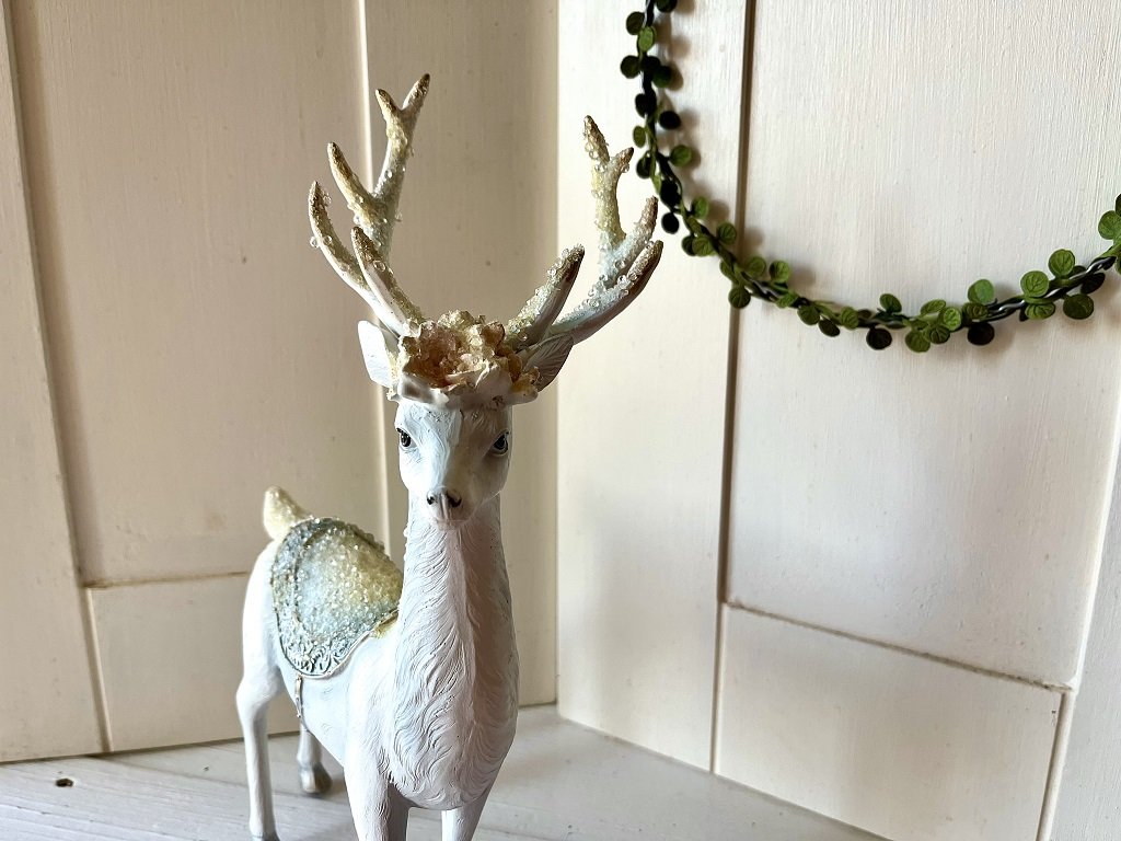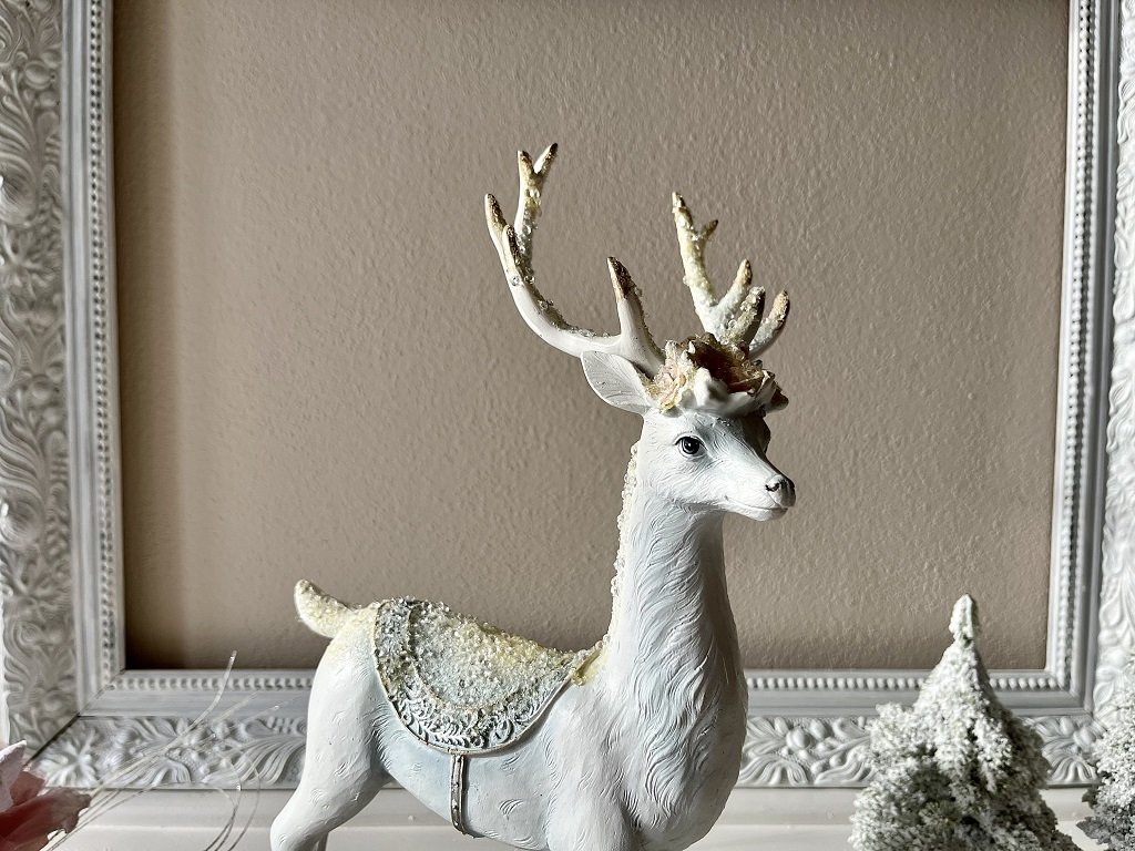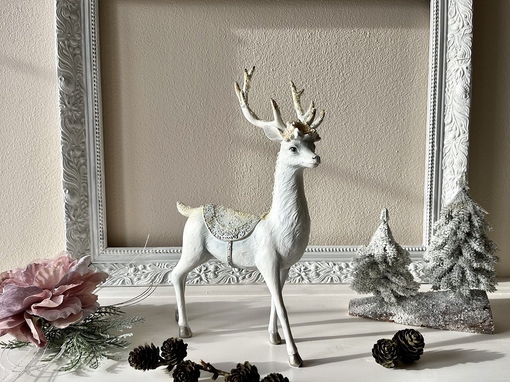 Ozdobte si Vánoce. Nádherný bílý jelen s kapkami rosy na paroží se stane nepřehlédnutelnou dekorací jak na svátečně prostřeném stole, tak v dalších aranžmá, která podtrhnou kouzlo Vánoc u Vás doma.