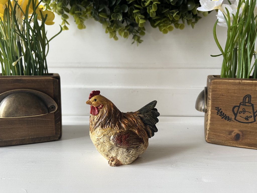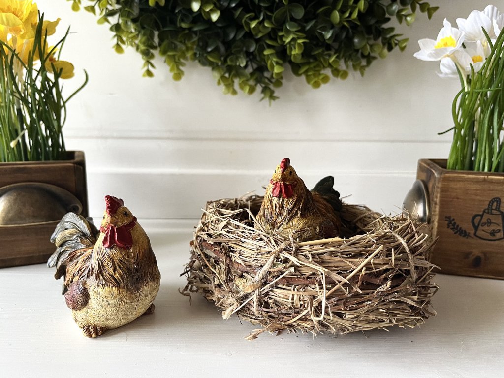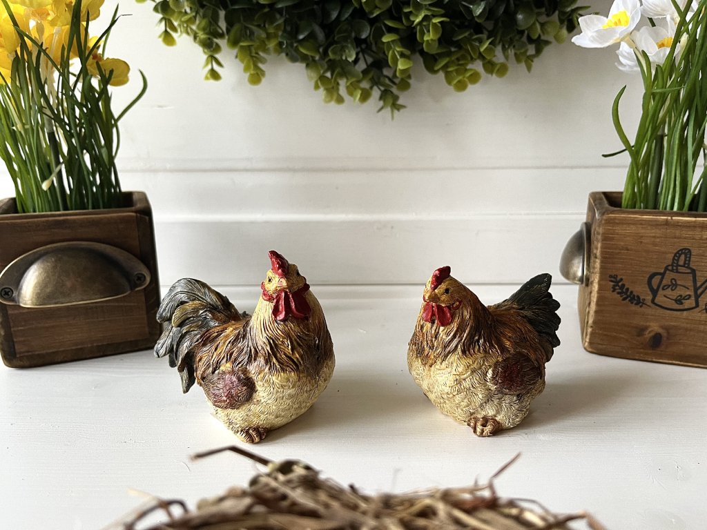 Krásně vybarvená hnědá slepička a kohoutek dozdobí vaše jarní aranžmá, ať již na stole, komodě nebo na zahradě.