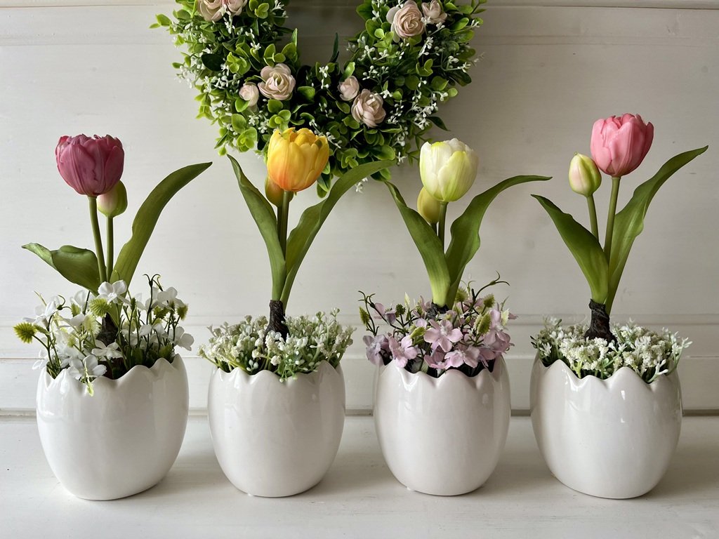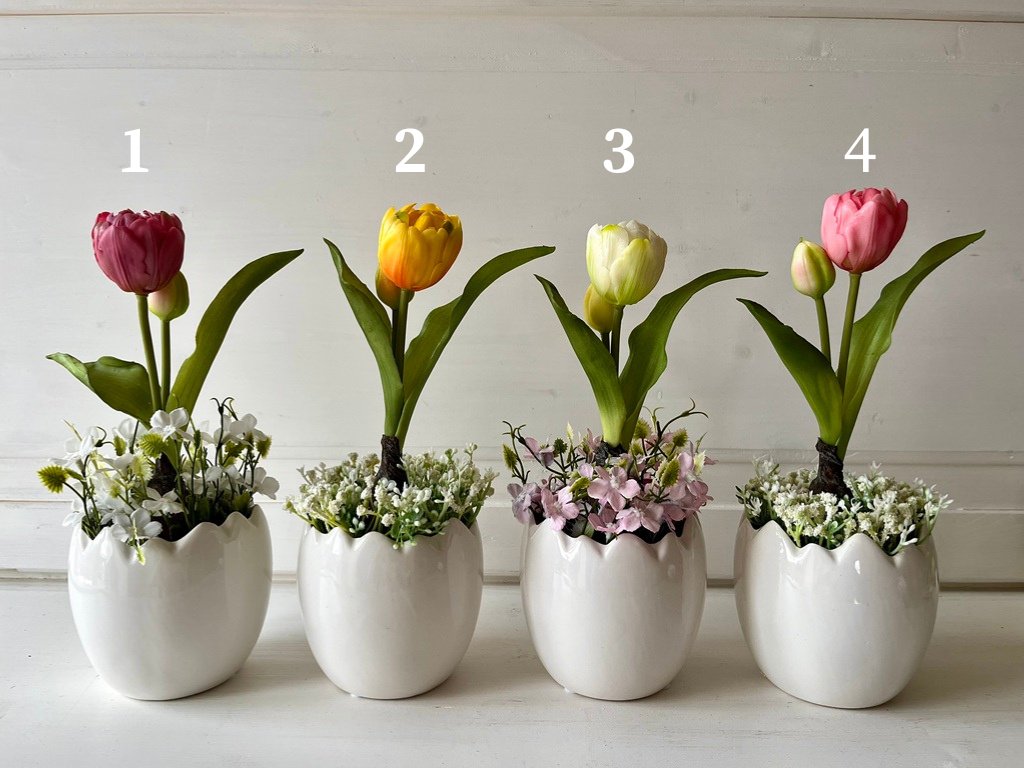 Ozdobte si jaro. Tulipány v různých odstínech v bílém květináči ve tvaru skořápky Vám bude dělat radost na hezky prostřeném stole nebo komodě.