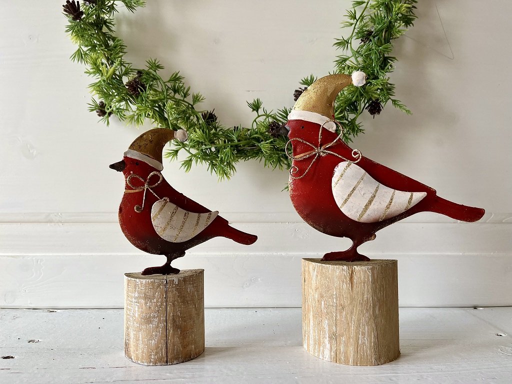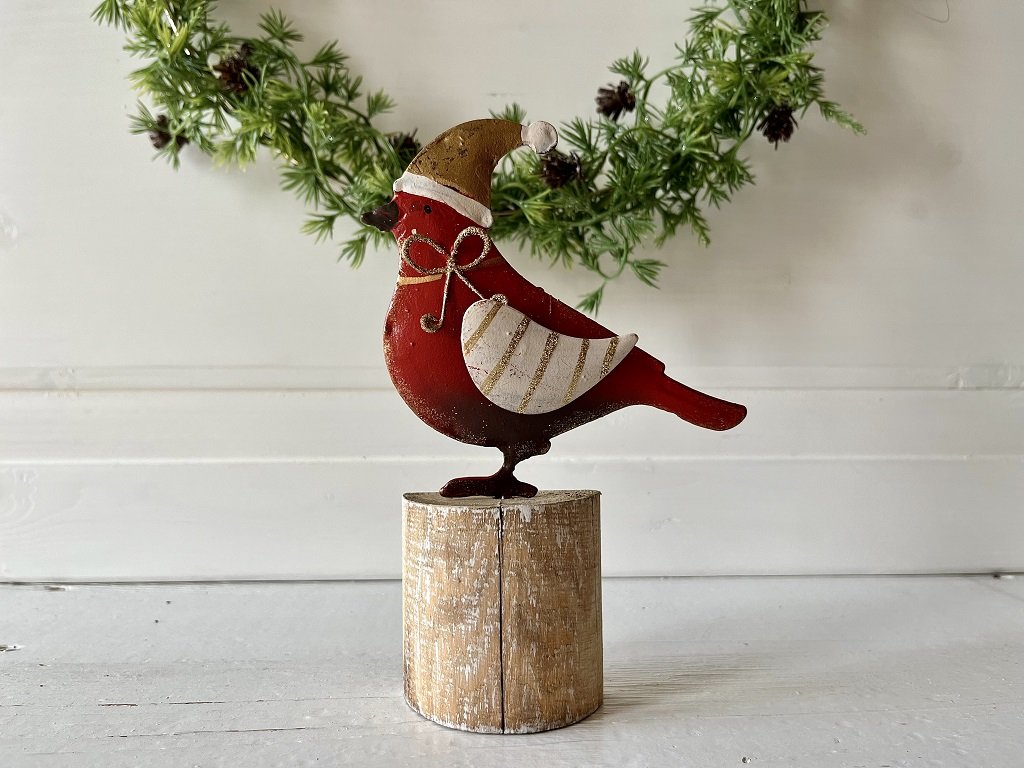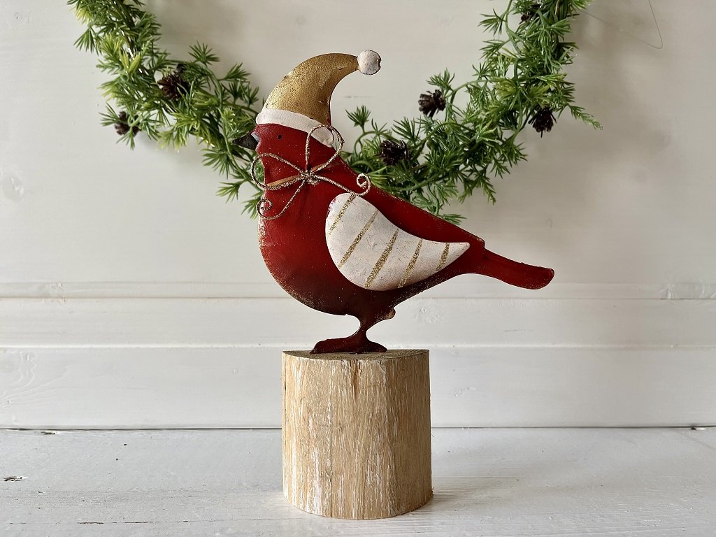 Ozdobte si Vánoce. Červený kovový ptáček na podstavci se zlatou čepicí a mašlí dotvoří atmosféru Vašich slavnostních aranžmá.