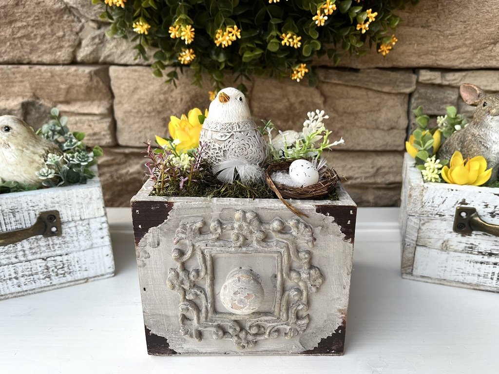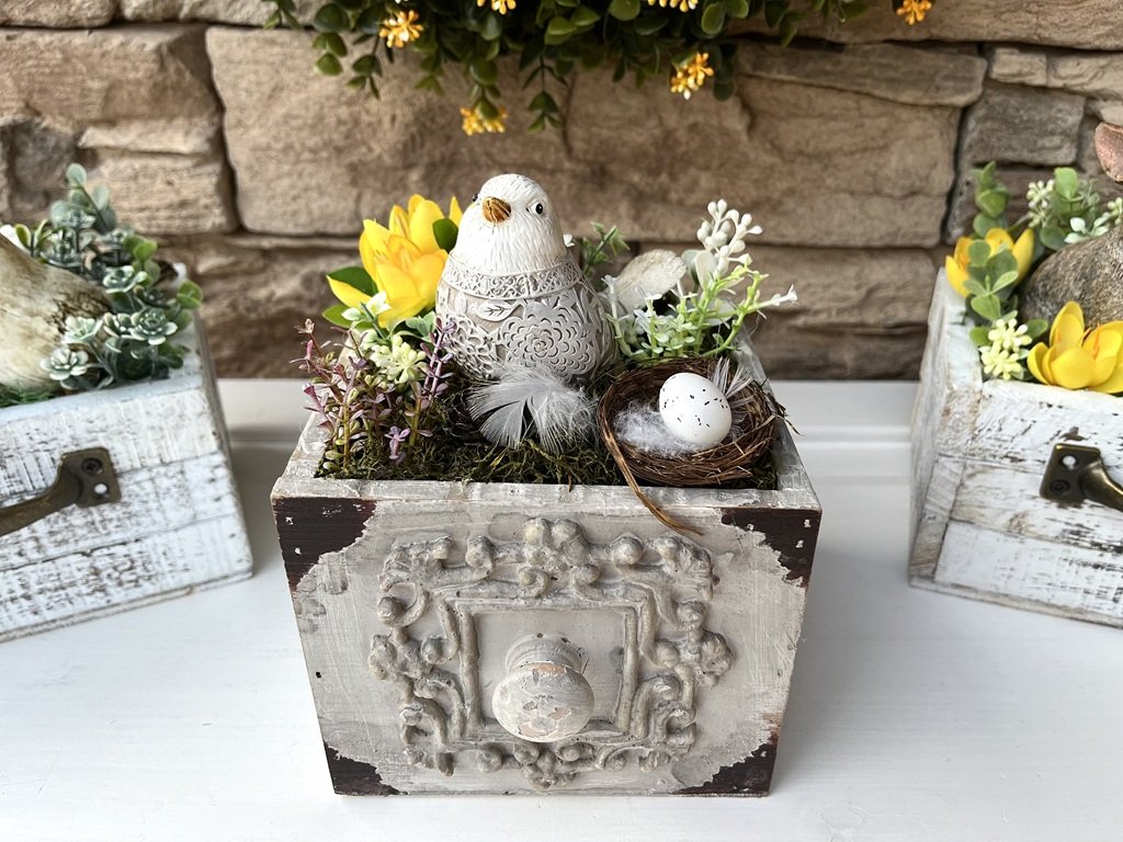 Ozdobte si jaro. Dekorace v šedém šuplíku s výraznou patinou a ptáčkem vám bude dělat radost na hezky prostřeném stole nebo komodě.