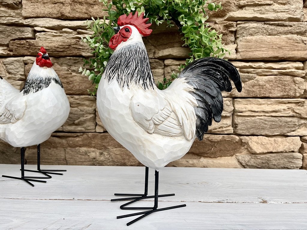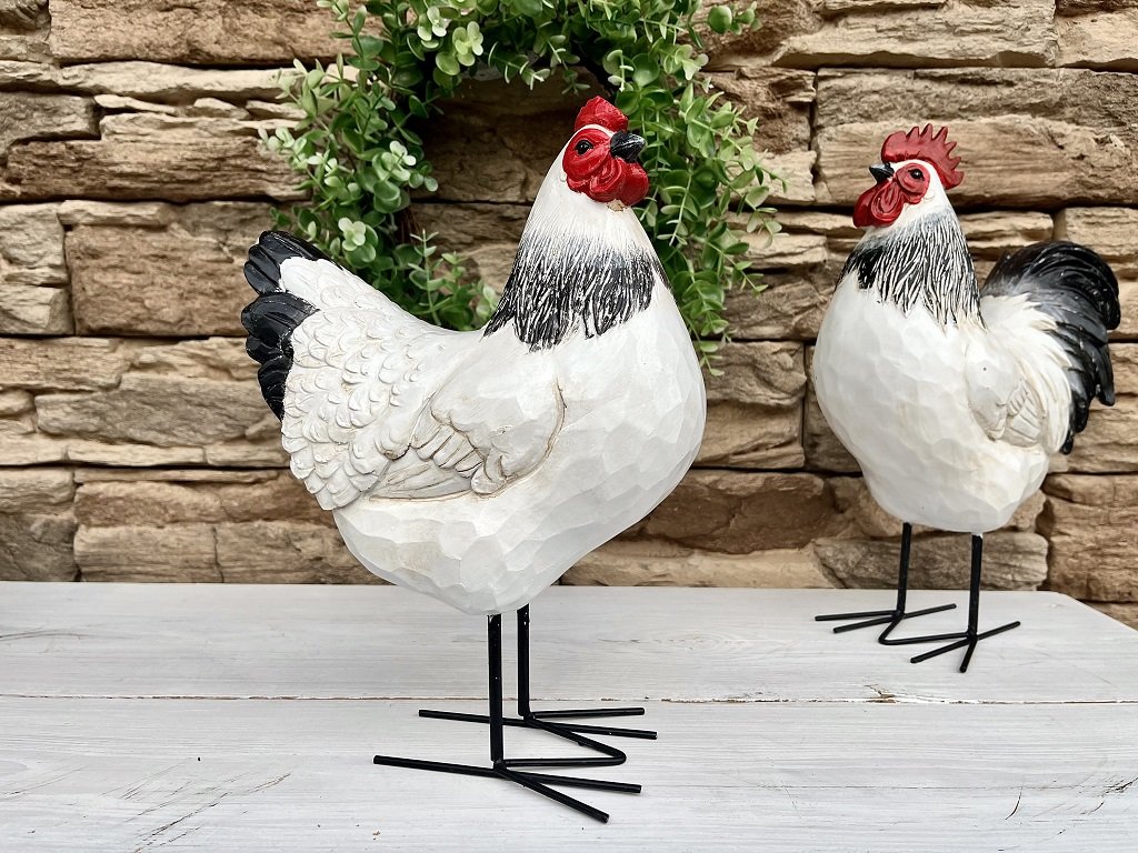 Jsou pár a pěkně jim to spolu ladí. Slepička a kohoutek v bílo-černé barvě dozdobí Vaše jarní aranžmá, ať již na stole, komodě nebo na zahradě.