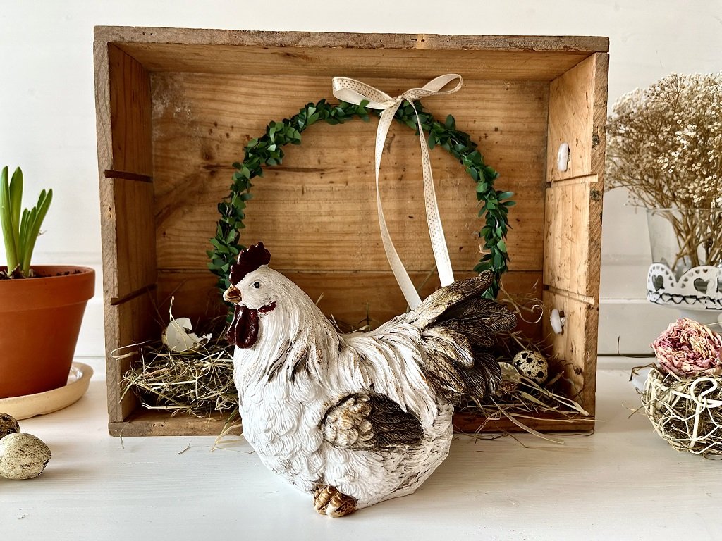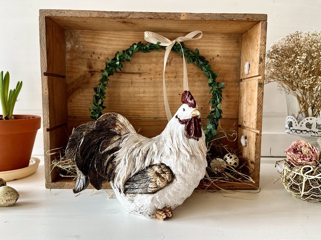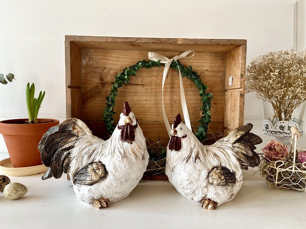 Bílo-hnědá slepička a kohoutek v hezkém provedení dozdobí Vaše jarní aranžmá, ať již na stole, komodě nebo na zahradě.