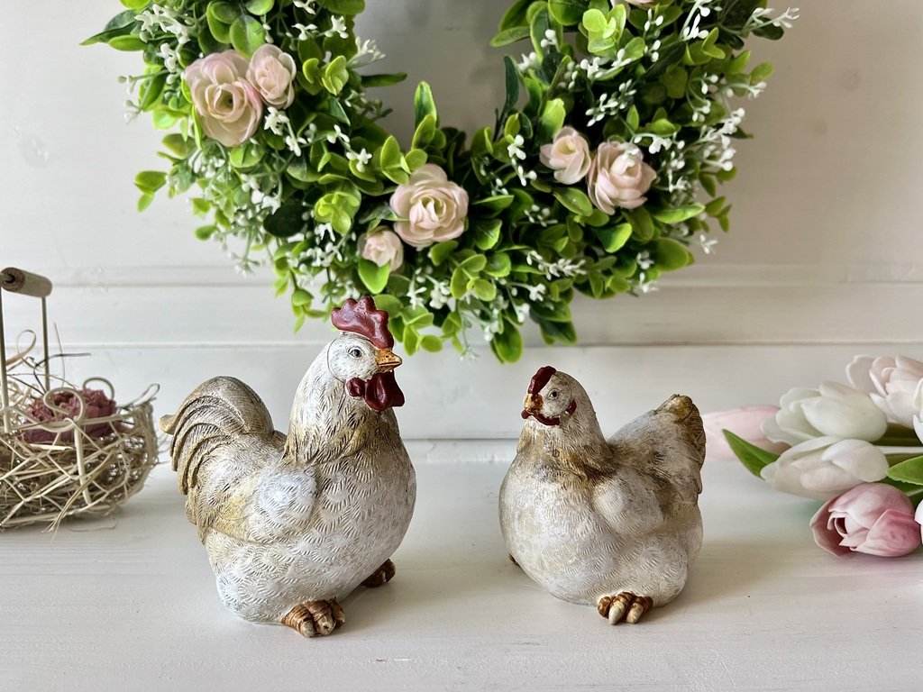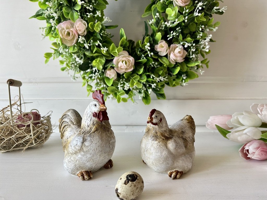 Smetanovo-hnědá slepička a kohoutek v hezkém provedení dozdobí Vaše jarní aranžmá, ať již na stole, komodě nebo na zahradě.