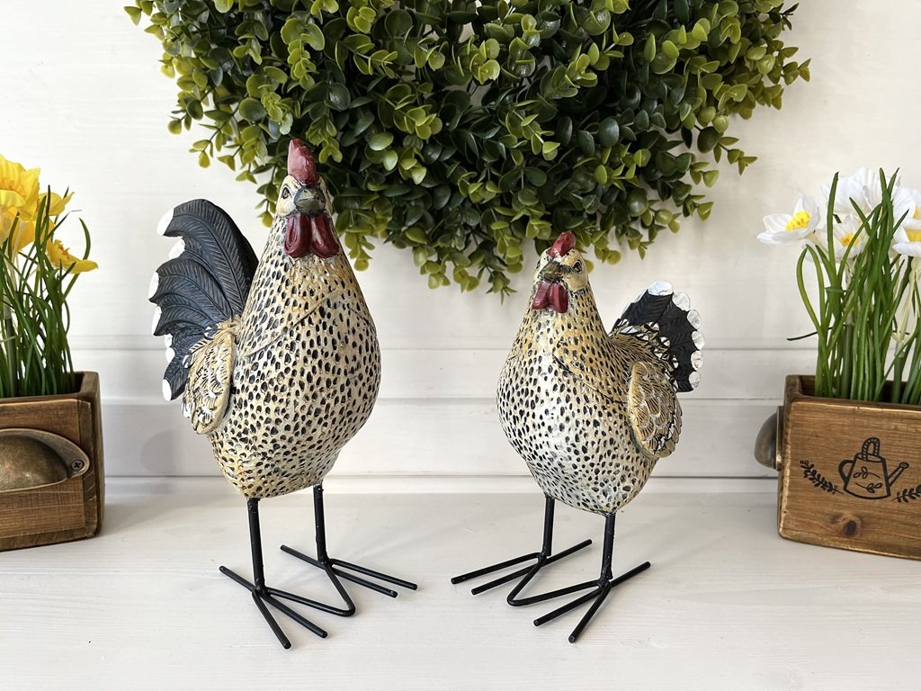 Ozdobte si jaro. Jsou pár a pěkně jim to spolu ladí. Kropenatá slepička a kohoutek dozdobí vaše jarní aranžmá, ať již na stole, komodě nebo na zahradě.