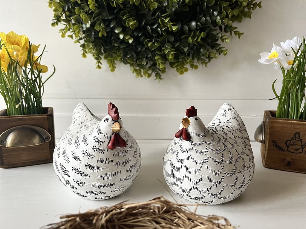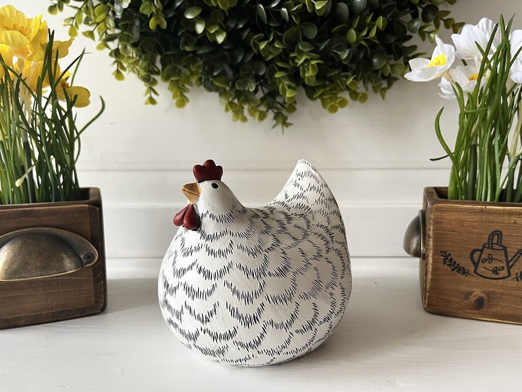 Krásně baculatá bílo-černá slepička dozdobí vaše jarní aranžmá, ať již na stole, komodě nebo na zahradě.