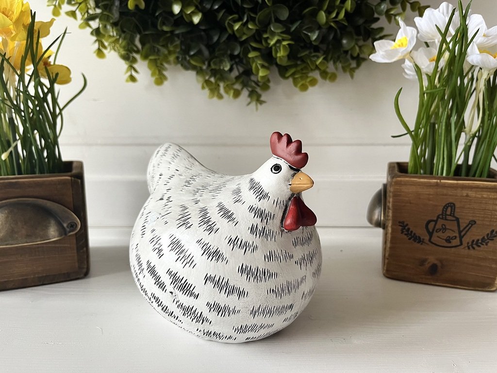 Krásně baculatá bílo-černá slepička dozdobí vaše jarní aranžmá, ať již na stole, komodě nebo na zahradě.