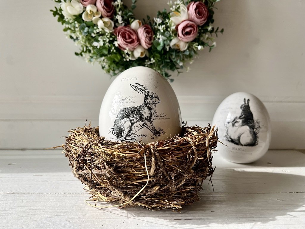 Krásné bílé dekorační vejce ve vintage stylu s motivem zajíce podtrhne kouzelnou atmosféru vašich jarních aranžmá.