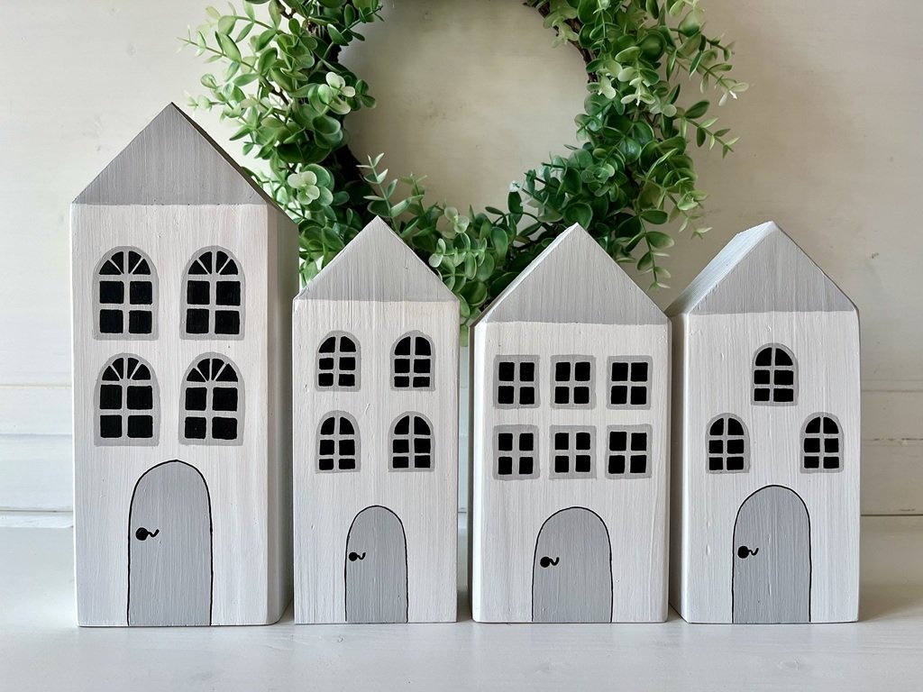 Dřevěné bílé domečky s šedou střechou vytvoří kouzelnou atmosféru u vás doma. Nakombinujte si je v různých barvách a velikostech a vytvořte si vlastní městečko.