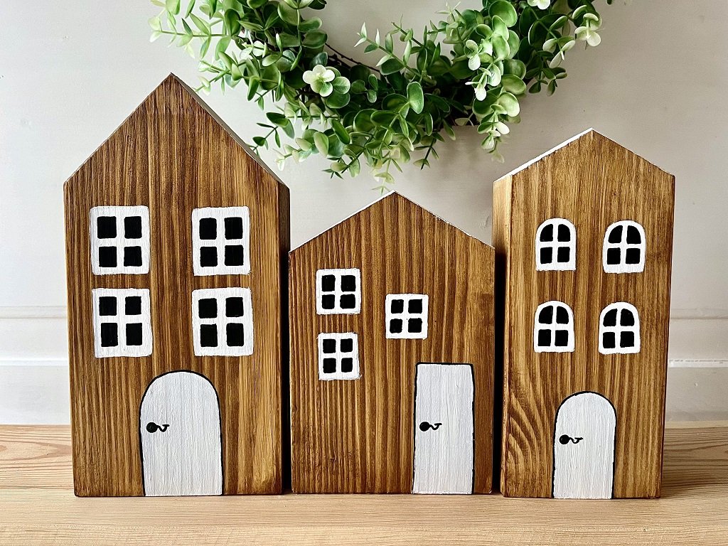 Dřevěné hnědé domečky s bílou střechou využijete jako celoroční dekoraci. Nakombinujte si je s dalšími domečky v různých barvách a velikostech a vytvořte si tak vlastní městečko.