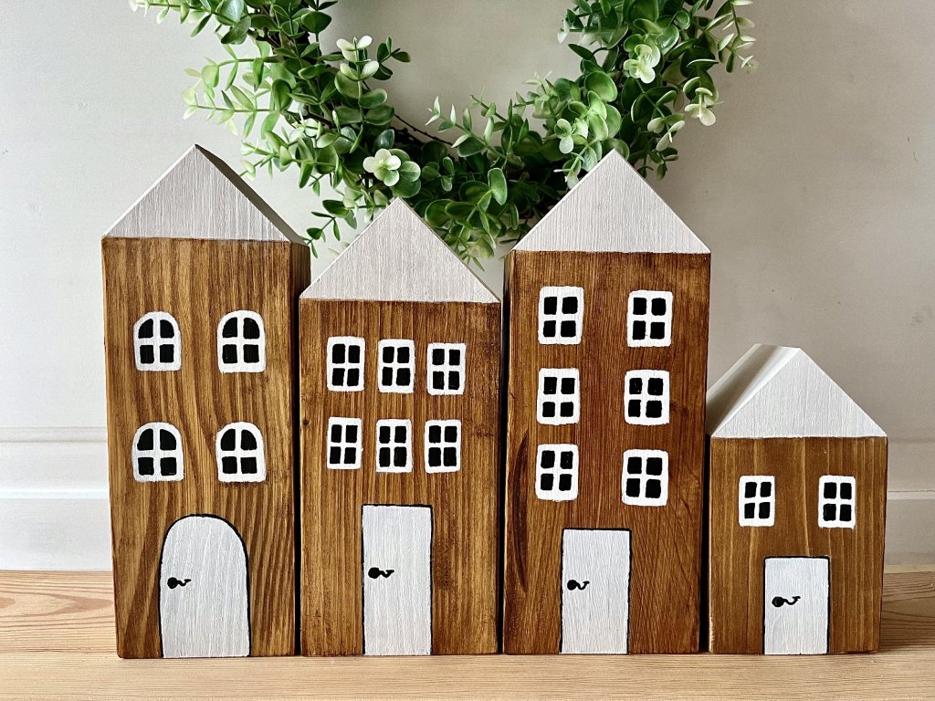 Dřevěné hnědé domečky s bílou střechou využijete jako celoroční dekoraci. Nakombinujte si je s dalšími domečky v různých barvách a velikostech a vytvořte si tak vlastní městečko.