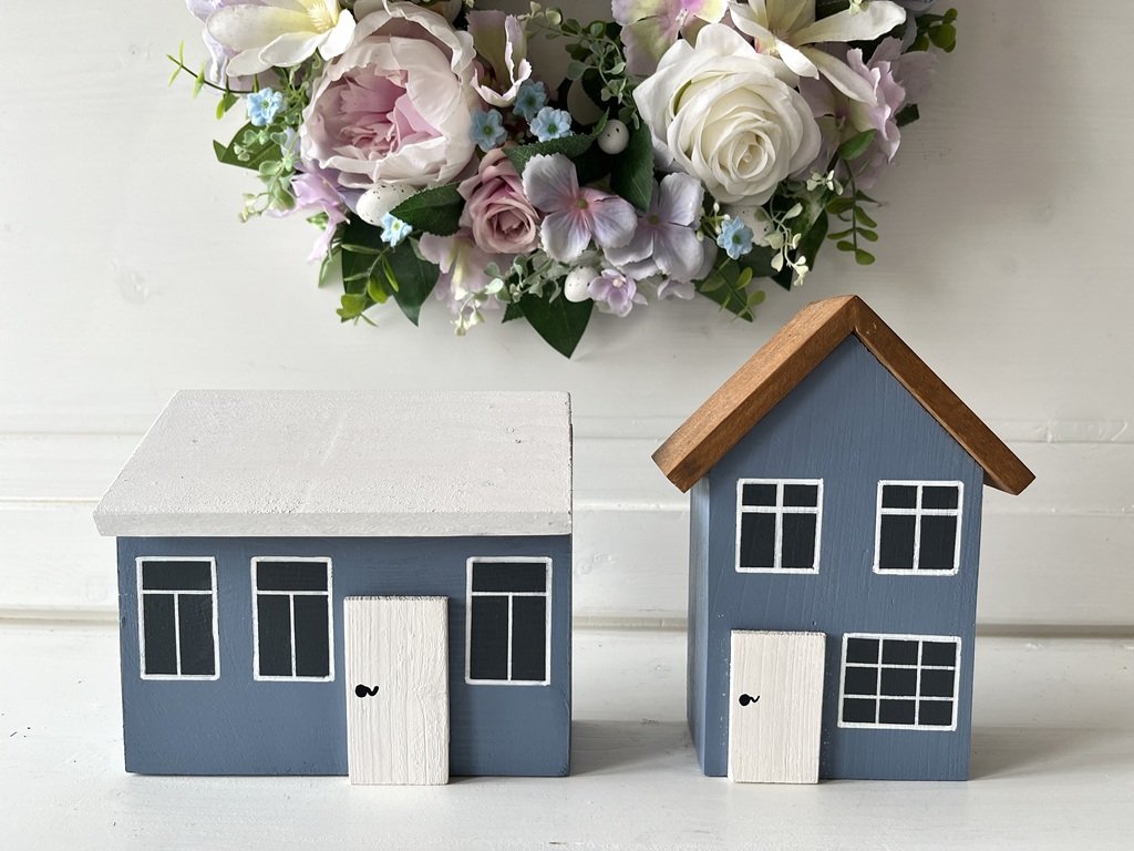 Dřevěné modré domečky s bílými dveřmi využijete jako celoroční dekoraci. Nakombinujte si je s dalšími domečky v různých barvách a velikostech a vytvořte si tak vlastní městečko.