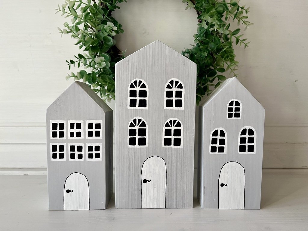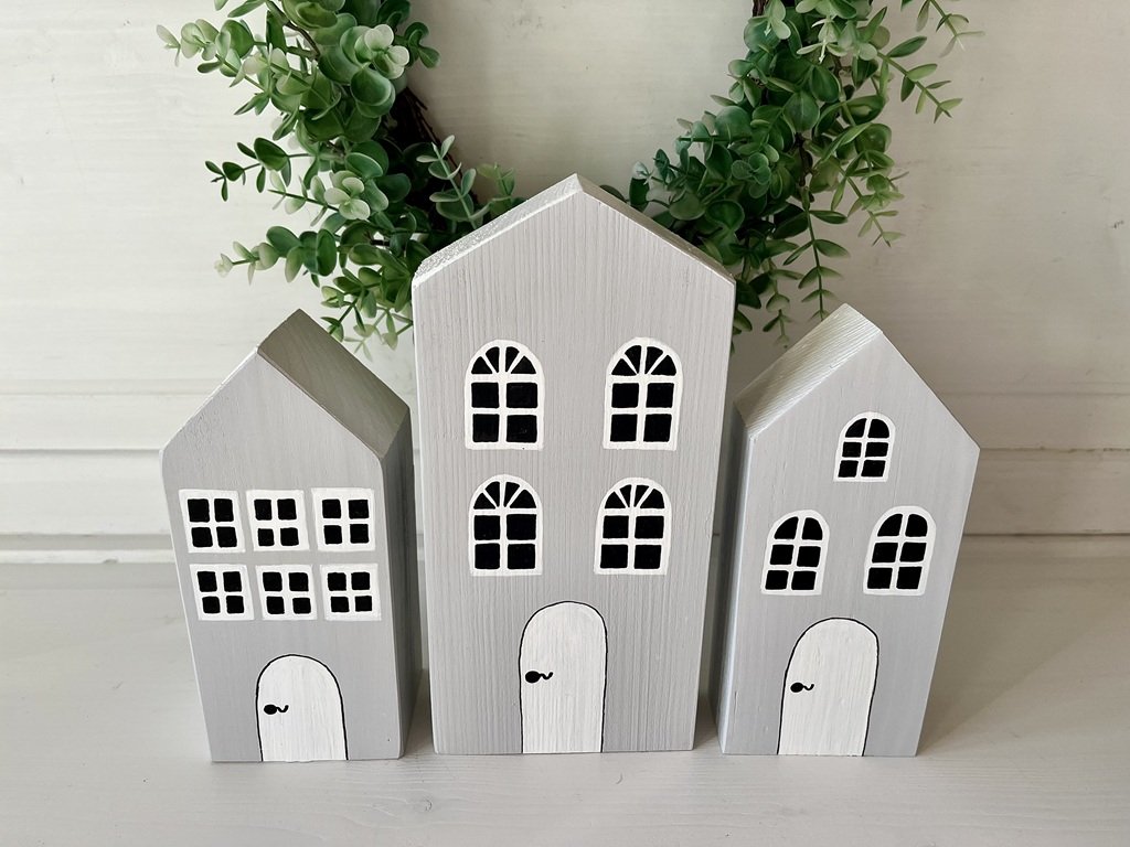 Dřevěné šedé domečky s bílou střechou využijete jako celoroční dekoraci. Nakombinujte si je s dalšími domečky v různých barvách a velikostech a vytvořte si tak vlastní městečko.