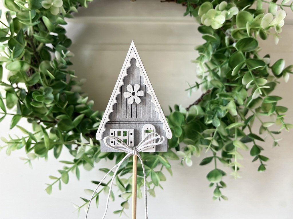 Šedý zápich domečku s bílou střechou, okénkem a dveřmi dozdobí Vaše truhlíky, květináče a jiné nádoby po celý rok.
