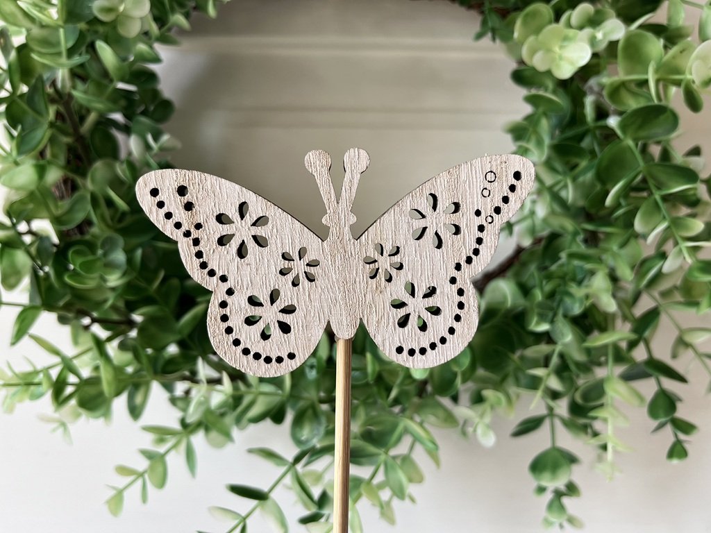 Dřevěný zápich ve tvaru motýla dozdobí Vaše truhlíky, květináče a jiné nádoby po celý rok.