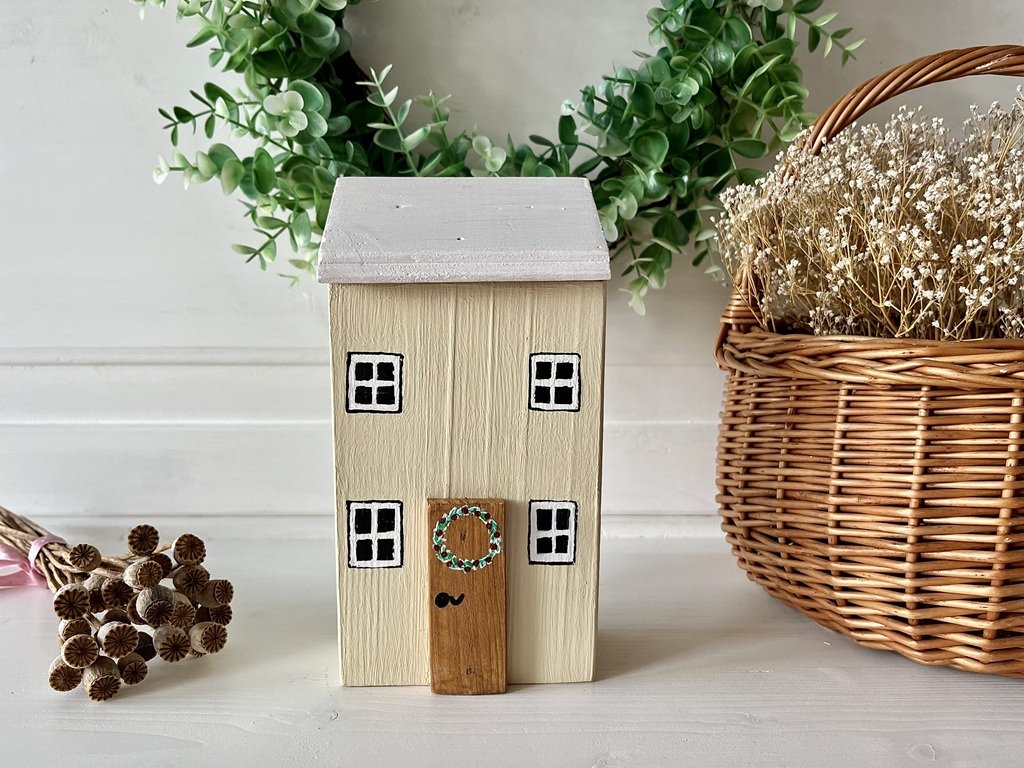 Dřevěný žlutý domeček s bílou střechou využijete jako celoroční dekoraci. Nakombinujte si ho s dalšími domečky v různých barvách a velikostech a vytvořte si tak vlastní městečko.