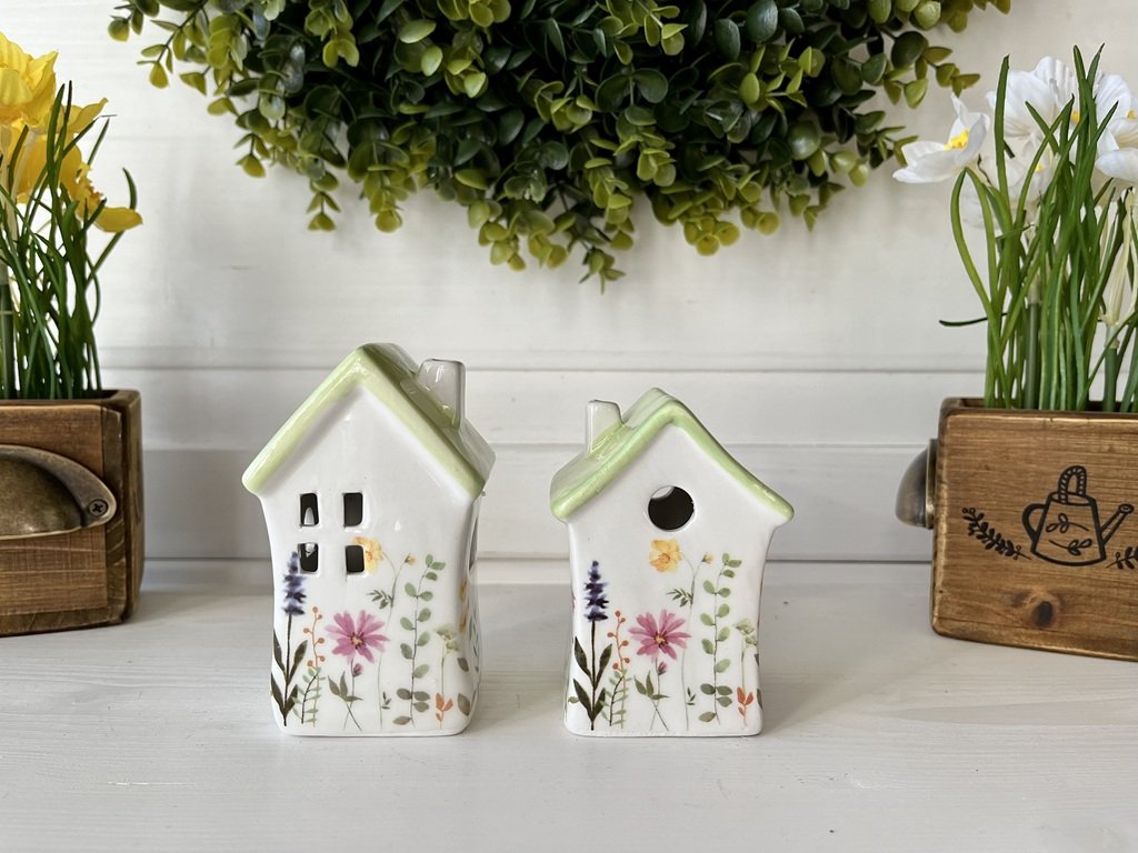 Ozdobte si domov. Jarní keramické LED domečky s květinami a zelenou střechou ve dvou provedeních můžete využít při tvorbě vašich aranžmá, např. jako jednu z dekorací na podnosu.