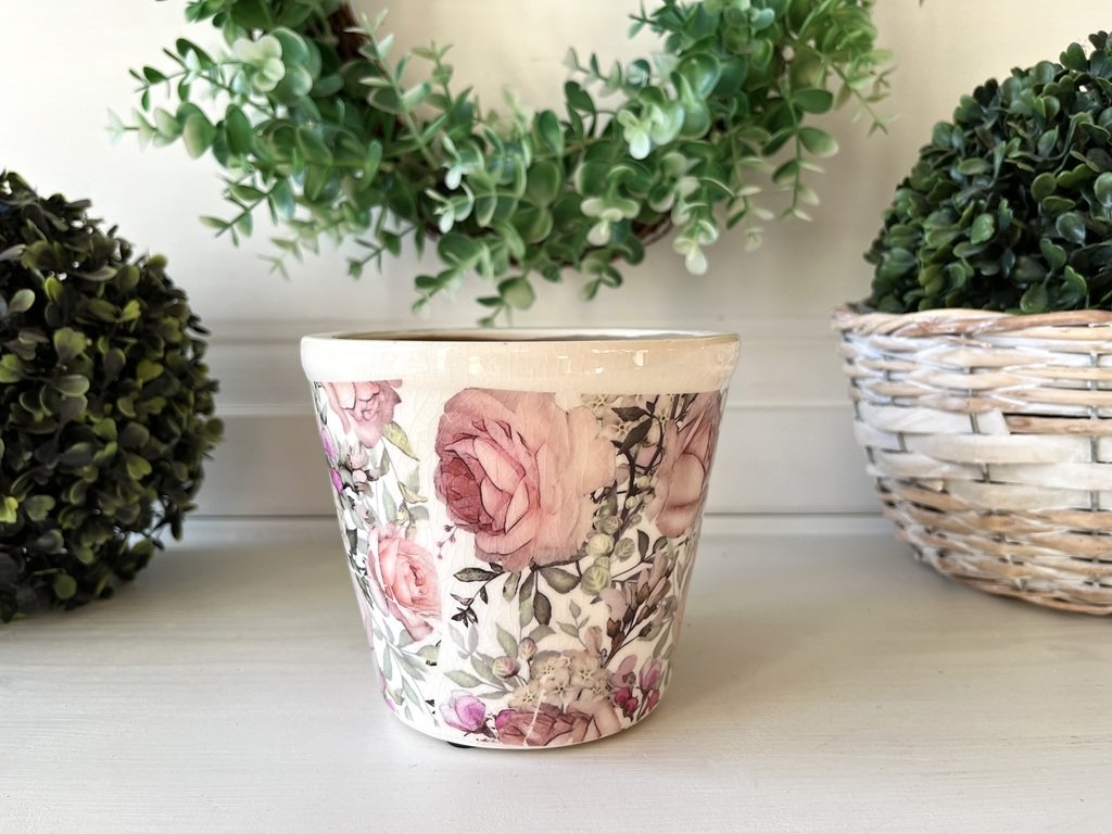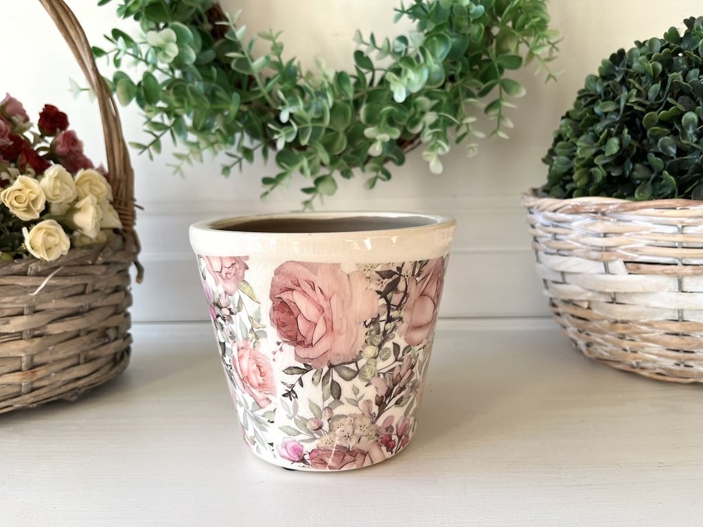 Keramický obal na květináč s úmyslně popraskaným povrchem a krásným dekorem růží bude slušet každé květině. Nechte rozkvést váš parapet nebo komodu růžovou krásou.