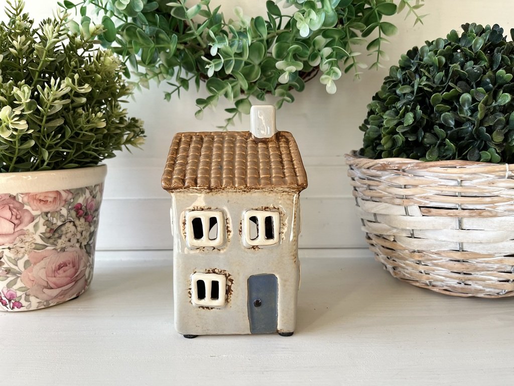 Keramický domek na čajovou svíčku ve světle modré barvě s hnědou střechou vykouzlí hřejivou atmosféru ve vašem domově za dlouhých podzimních a zimních večerů. Nakombinujte si jich několik dohromady a vytvořte si vlastní malé městečko.