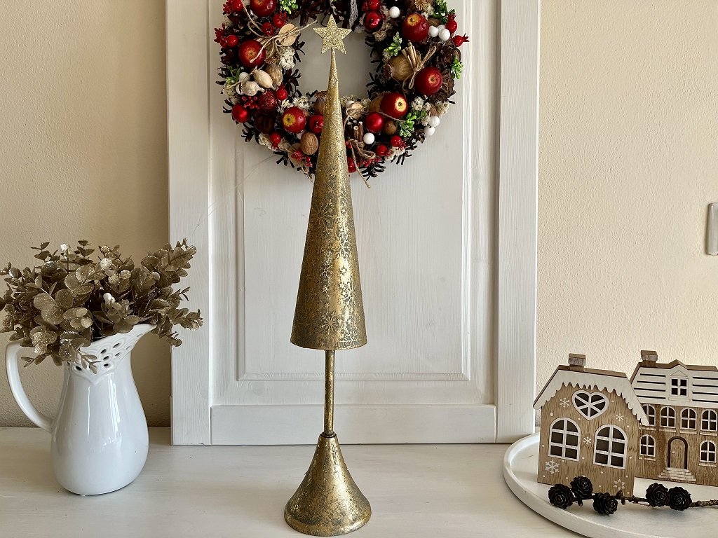 Ozdobte si Vánoce. Kovový stromek - kužel na podstavci s vločkami ve zlaté barvě dotvoří atmosféru Vašich slavnostních aranžmá.