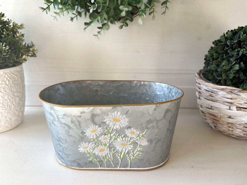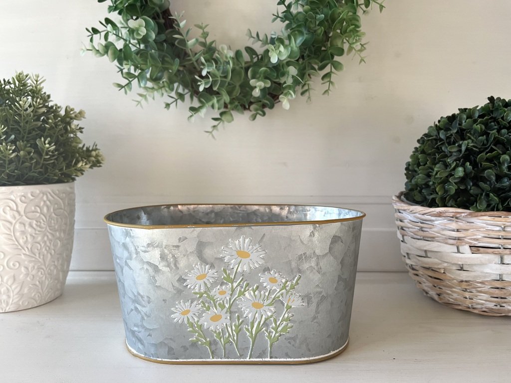 Plechovou oválnou nádobu s jemným motivem kopretin můžete osázet jarními květinami jako jsou petrklíče, modřence, macešky nebo ho využít jako základ pro tvorbu vlastních dekorací.