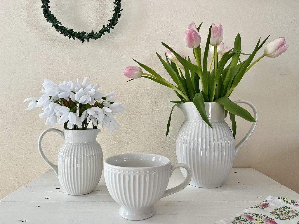 Jemné detaily, jednoduchost a elegance charakterizují džbán v bílé barvě z kolekce Alice pro všední den. Na mléko, čaj, studený nápoj anebo třeba na luční kvítí...