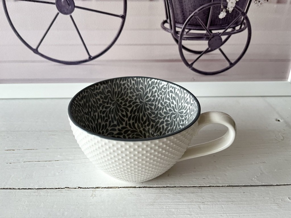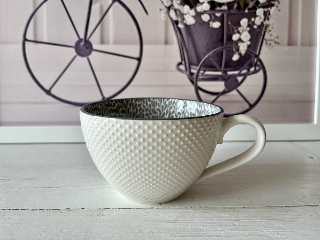 Porcelánový hrnek s plastickými puntíky na hrnku a ornamenty uvnitř potěší ty, co mají rády rafinovanost. Uvařte si čaj a uvelebte se s knížkou na oblíbeném místě...