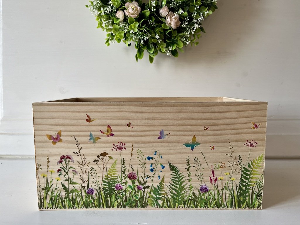 Přírodní dřevěný truhlík s motivem rozkvetlé louky můžete osázet jarními květinami jako jsou petrklíče, modřence, macešky nebo ho využít jako základ pro tvorbu vlastních dekorací.