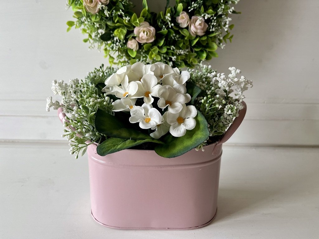 Ozdobte si jaro. Bílé květy fialky s dalšími květinami v plechové růžové nádobě Vám budou dělat radost na hezky prostřeném stole nebo komodě.