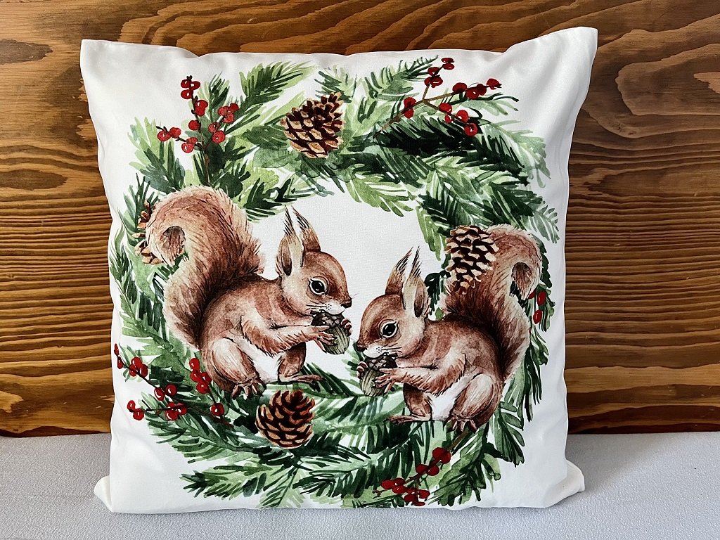 Ozdobte si Vánoce. Nádherný dekorační povlak na polštář s veverkami na věnci vnese do Vašeho interiéru kouzelnou atmosféru zimy. Nakombinujte ho s jinými polštáři a útulnost je zaručena.