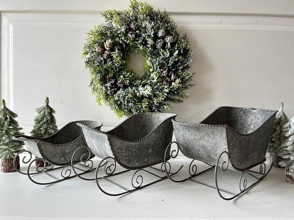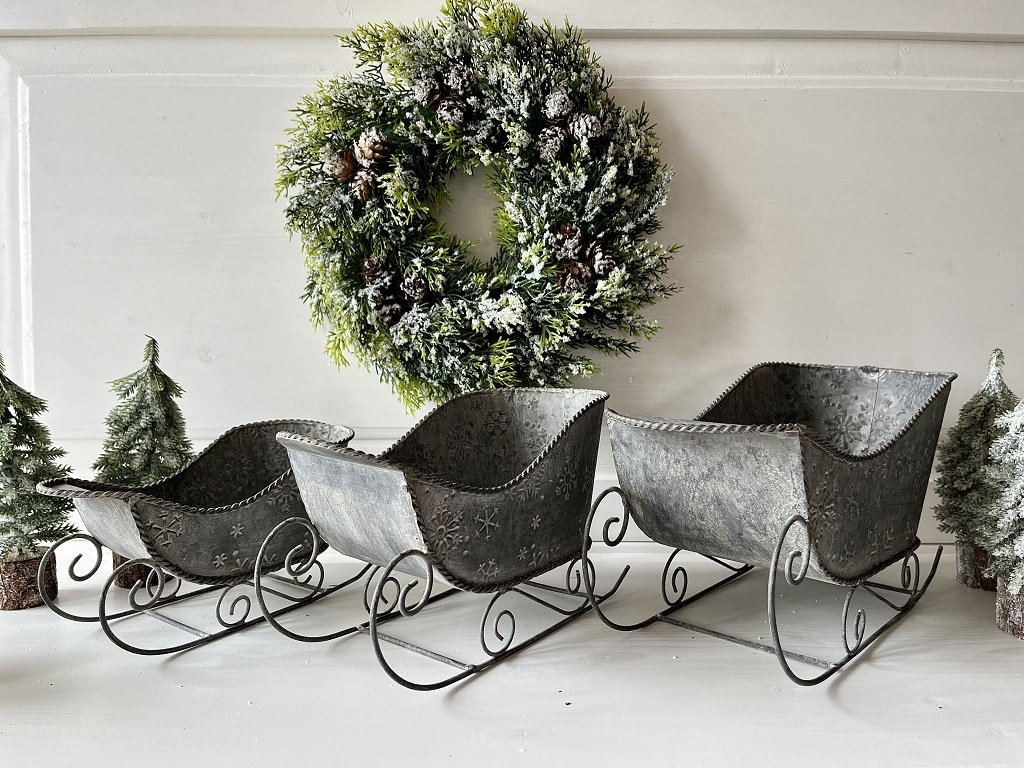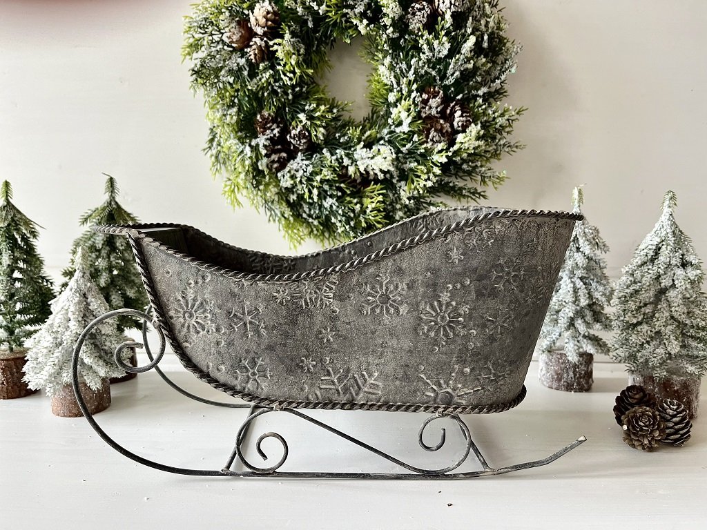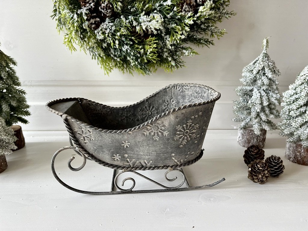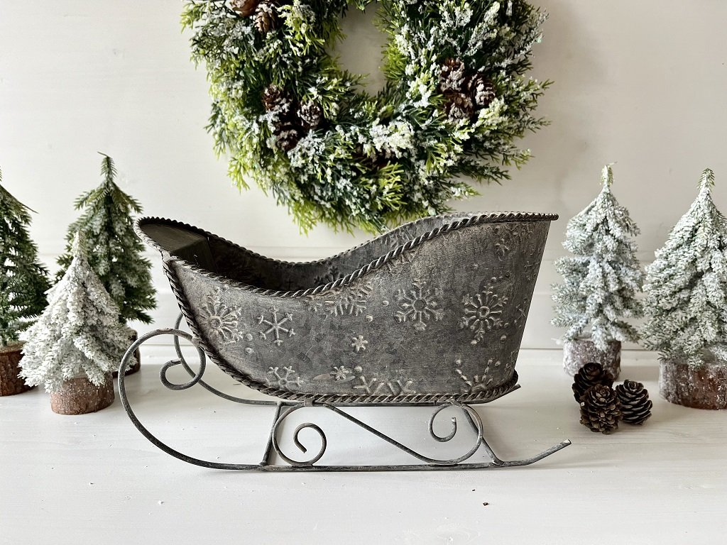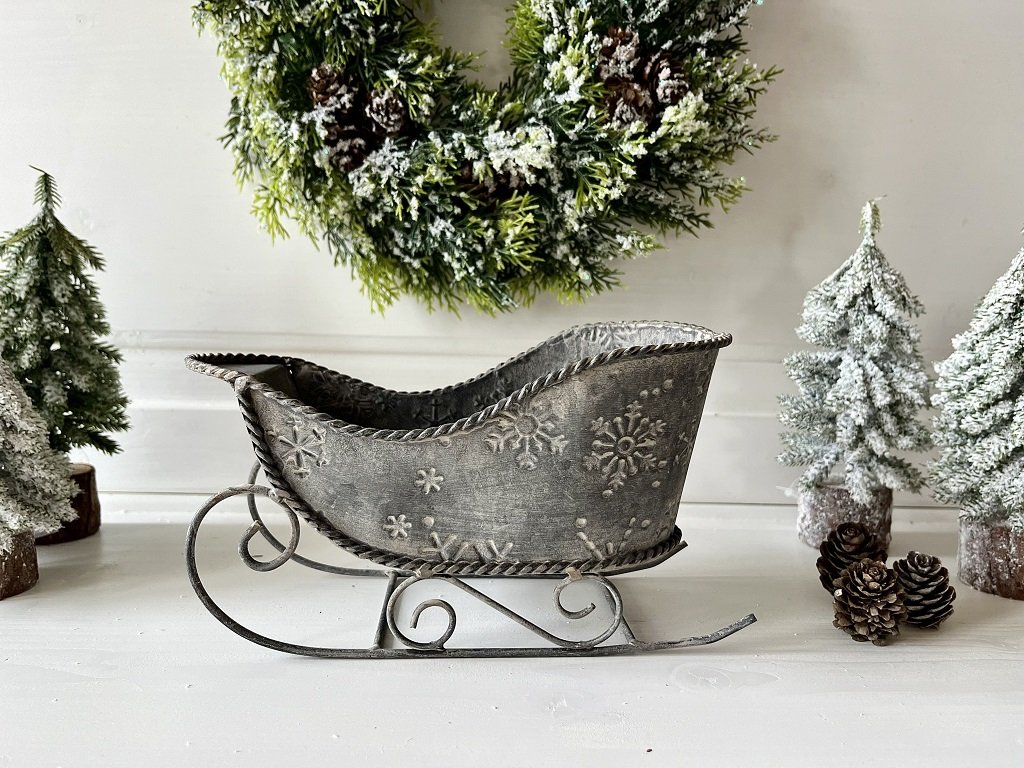 Ozdobte si Vánoce. Šedé plechové sáně s motivem vloček se stanou nepřehlédnutelnou ozdobou Vašich slavnostních aranžmá a zaujmou malé i velké.