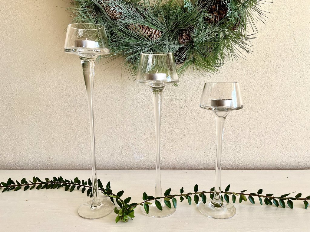 Ozdobte si Vánoce. Set tří skleněných čajových svícnů na úzké noze podtrhne slavnostní atmosféru Vašeho svátečně prostřeného stolu.