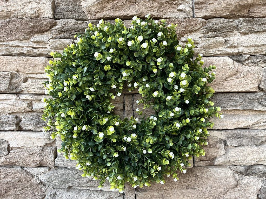 Velký a bohatý buxusový umělý věnec s drobnými bílými kvítky si můžete pověsit na dveře, stěnu nebo větší okno.