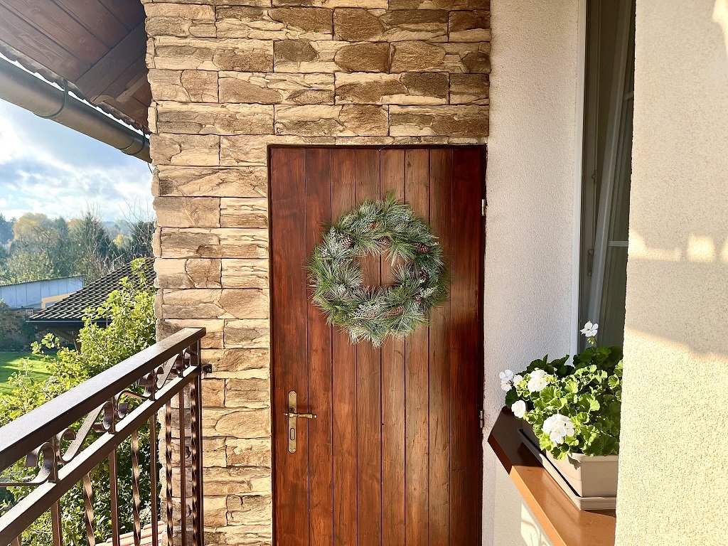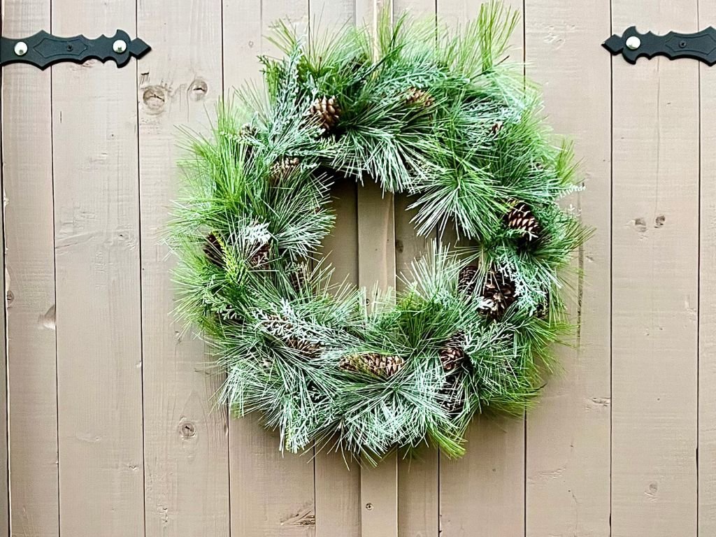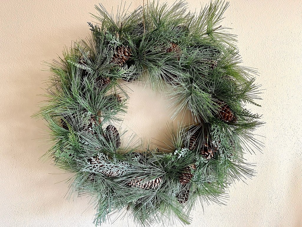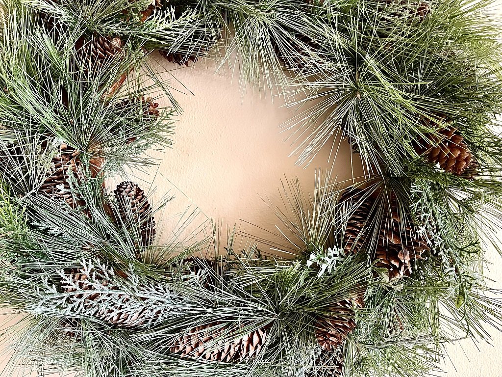 Ozdobte si Vánoce. Velký ojíněný věnec s šiškami se bude krásně vyjímat na vchodových dveřích nebo na zdi a můžete ho použít i jako dekoraci na slavnostně prostřeném stole.
