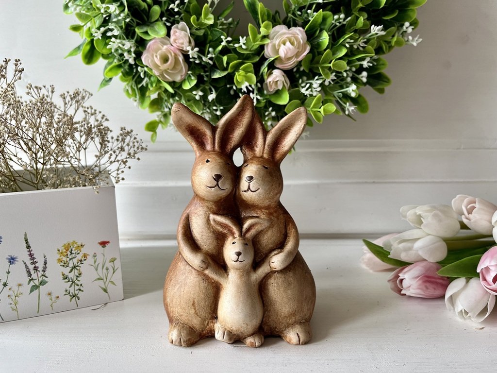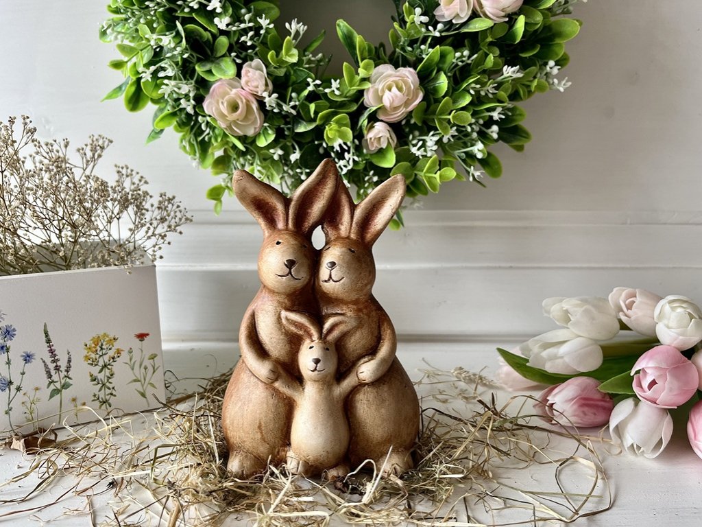 Velikonoční dekorace zaječí rodina ozdobí Vaše jarní aranžmá, ať už na stole, komodě nebo na zahradě.
