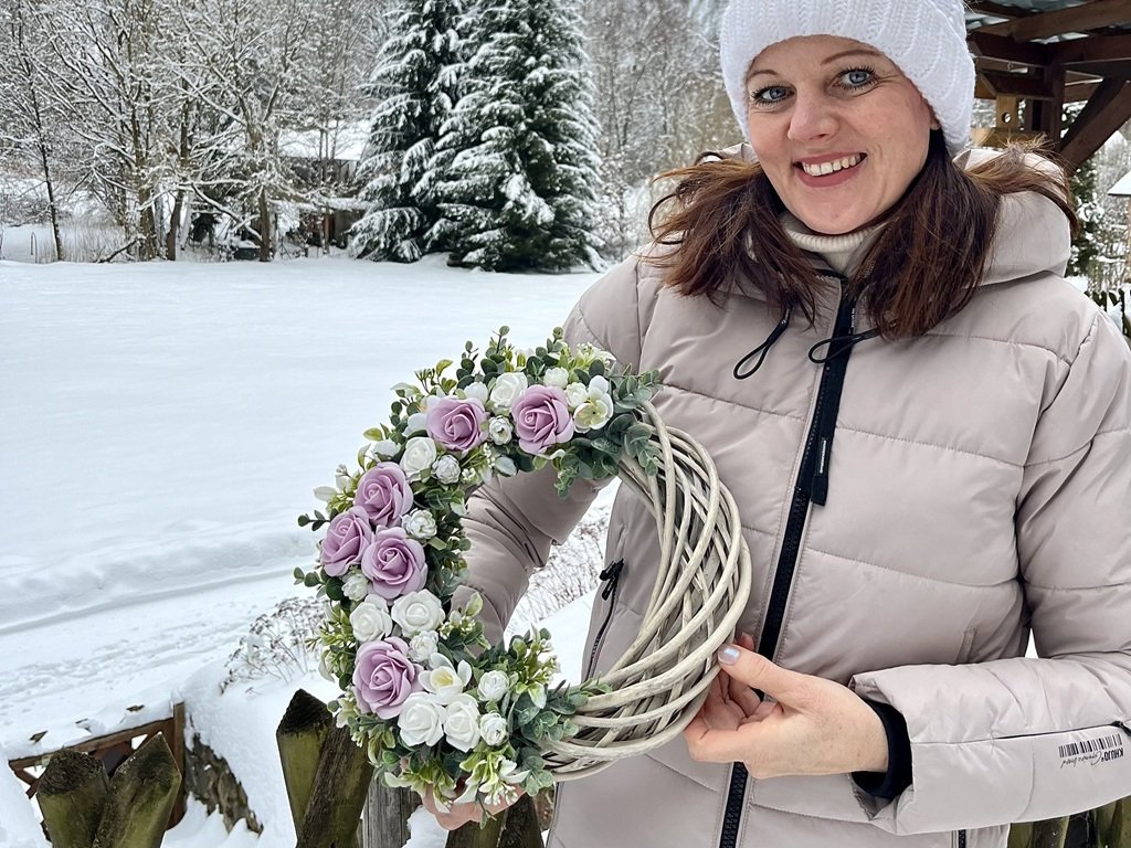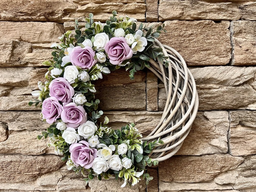 Umělý věnec z proutěného korpusu zdobený fialkovými růžemi, bílými růžičkami a krokusy si můžete pověsit na dveře nebo okno.
