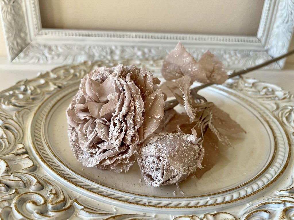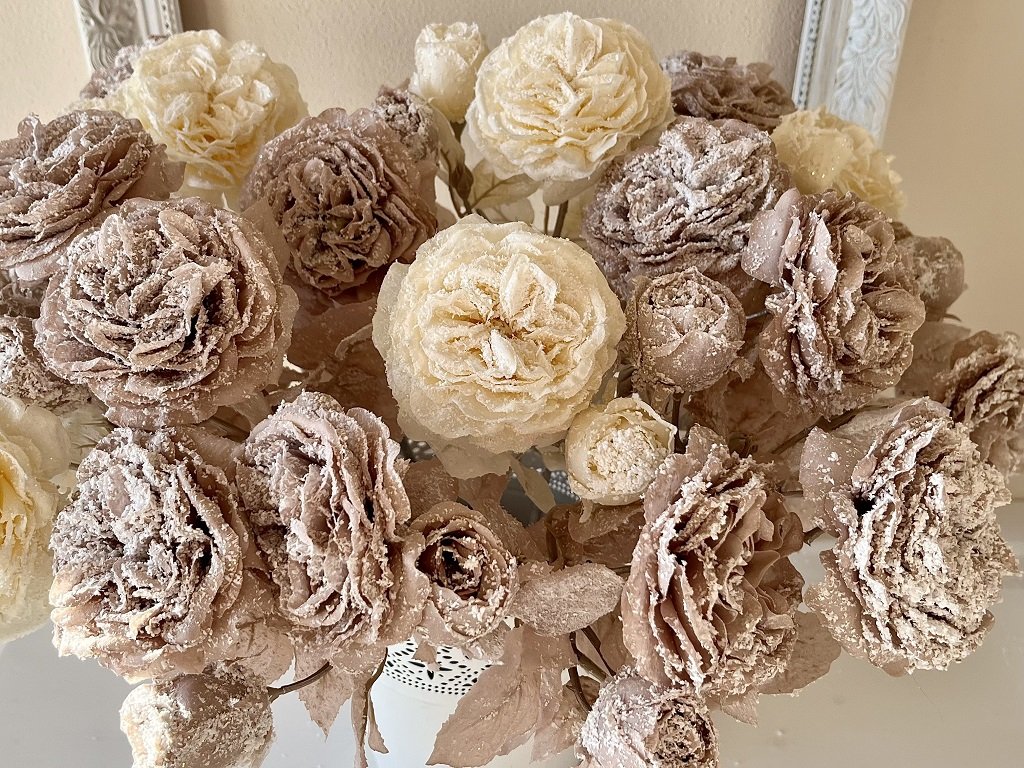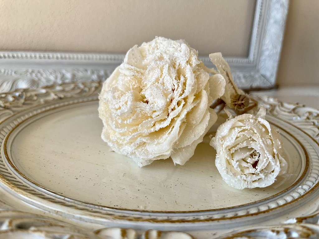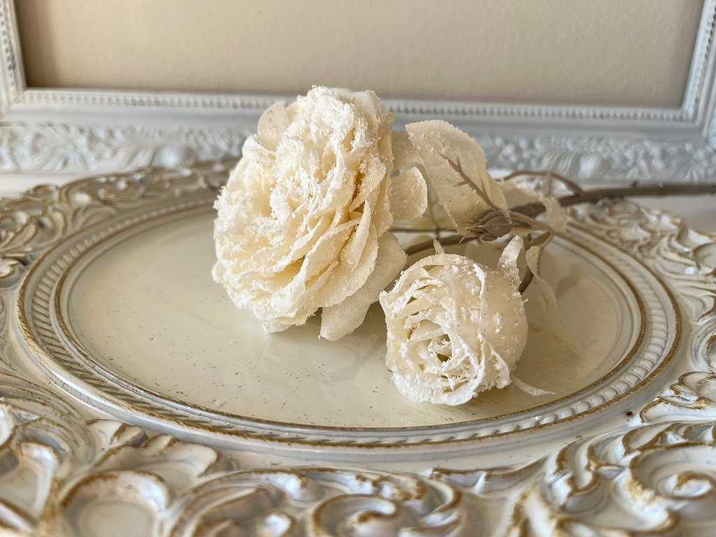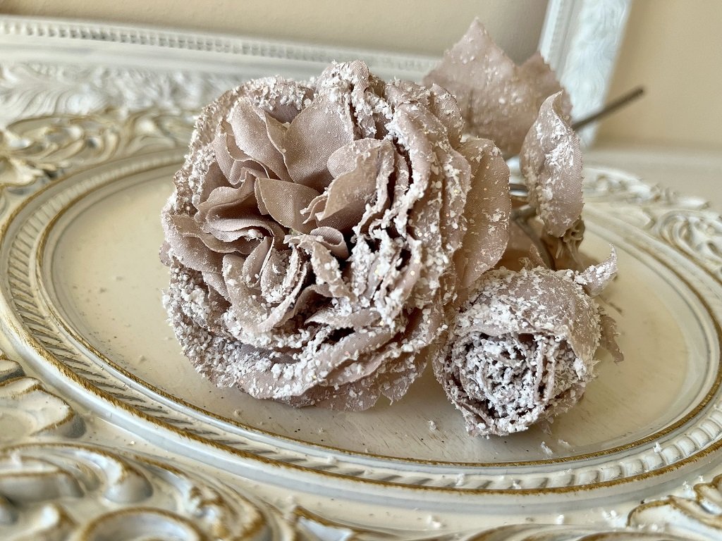 Ozdobte si Vánoce. Krásně propracovaná textilní zasněžená růže s menší růžičkou se bude hezky vyjímat ve váze nebo džbánu. Nakombinujte ji s větvičkami bobkovišně a sváteční kytice jako ze žurnálu je na světě.