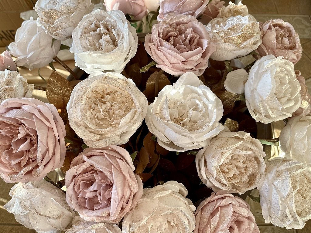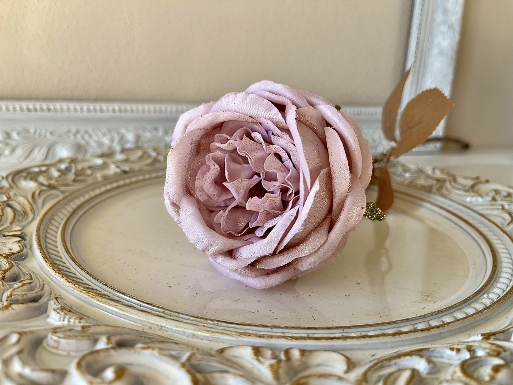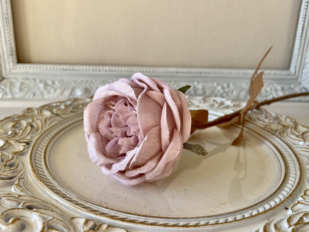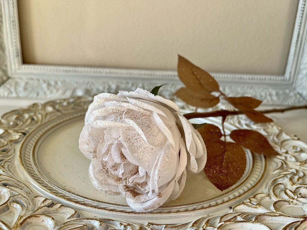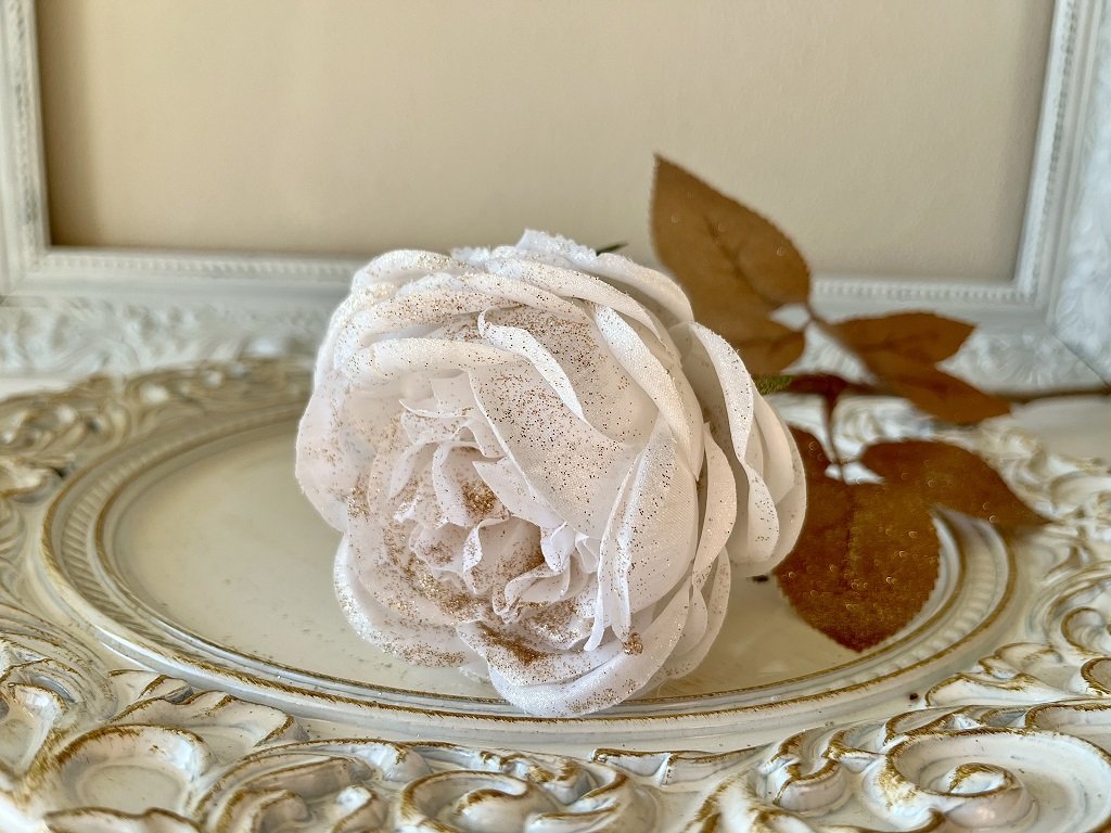 Ozdobte si Vánoce. Krásně propracovaná textilní růže se zlatými třpytkami a zlatými listy se bude hezky vyjímat ve váze nebo džbánu. Nakombinujte ji s větvičkami bobkovišně a sváteční kytice jako ze žurnálu je na světě.